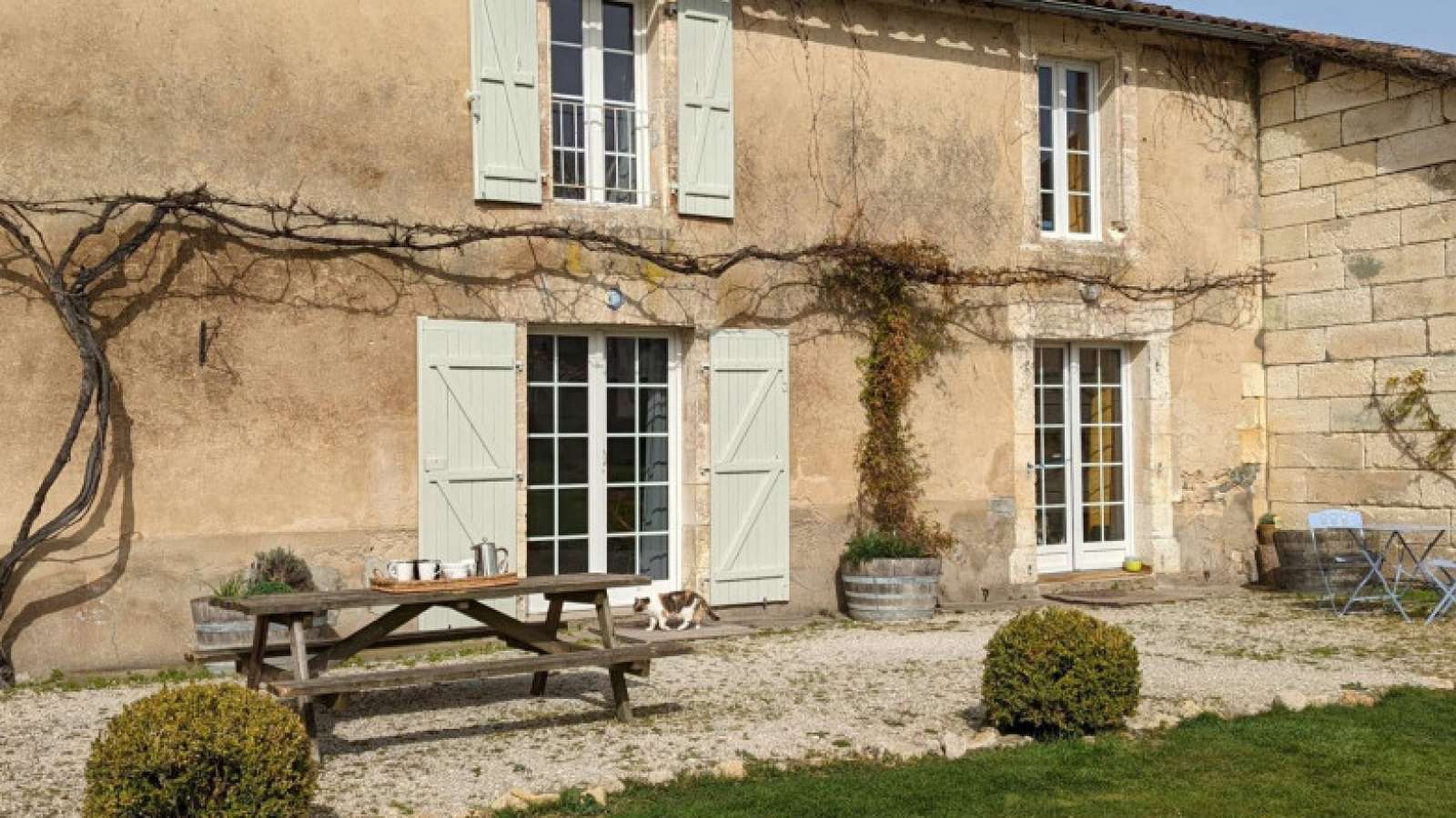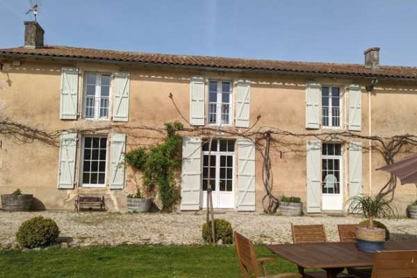 Ancienne longère rénovée, lumineuse et bien équipée. Le gîte est mitoyen à un autre gîte et bénéficie d'une piscine commune couverte et chauffée. Au cœur d'un domaine charentais de 35 hectares, vous profiterez des vergers de pruniers, de châtaigniers, d'étangs et de bois pour vous ressourcer. Rez-de-chaussée : séjour cuisine équipée, coin salon et espace repas, wc. A l'étage : deux chambres (une chambre avec 2 lits superposés et BZ de 140 et une autre chambre avec un lit de 140), salle d'eau et wc. Sur la propriété, à partager avec d'autres gîtes et les propriétaires : cour, jardin, vergers, bois, étangs, table de ping-pong, piscine couverte et chauffée (non surveillée) ouverte du 1er mai au 30 Septembre, WIFI avec répétiteur, accueil cheval et découverte sur place d'animaux (brebis, poules). Ce gite de 5 personnes peut être louer avec d'autres gites pour vos rassemblements familiaux.