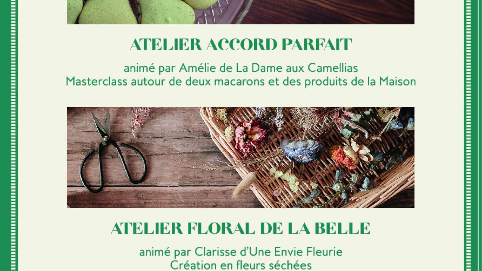 La Belle Soirée, une parfaite occasion de se retrouver ensemble pour partager un moment de convivialité ! 2 Ateliers aux choix suivis d'une soirée live music, cocktails et foodtruck dans notre jardin bucolique. A partir de 18h, deux ateliers au choix accompagnés de la dégustation d'un cocktail signature ATELIER ACCORD PARFAIT Animé par Amélie de la Dame aux Camélias. Masterclass autour de deux macarons et des produits de la Maison Créneaux : 18h-18h45 et 18h45-19h30 12 personnes par session ATELIER FLORAL DE LA BELLE Animé par Clarisse d'Une Envie Fleurie Création en fleurs séchées Créneaux : 18h-18h45 et 18h45-19h30 - 12 personnes par session De 19h à 22h, live music, cocktails et foodtruck dans notre jardin bucolique.