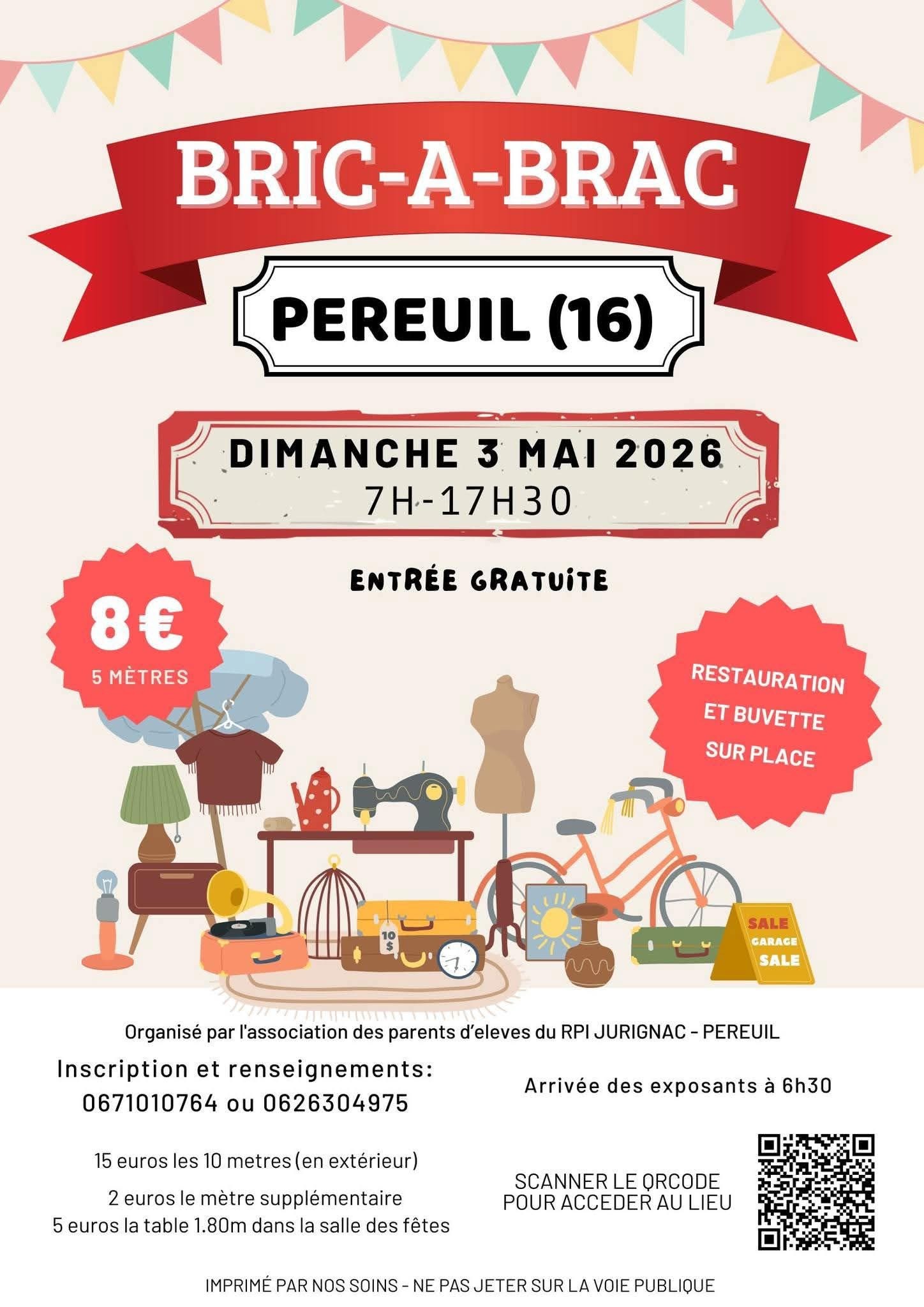 Venez nombreux au "Bric à Brac" de Val des Vignes, accueil des exposants dès 6h30. Profitez de la buvette et restauration sur place. Exposants en extérieur et intérieur. Extérieur : 5€ les 5 mètres et 2€ le mètre supplémentaire, Intérieur : 5€ la table d'1,80m (table fournie). Pas de portants. Exposants en alimentaire refusés