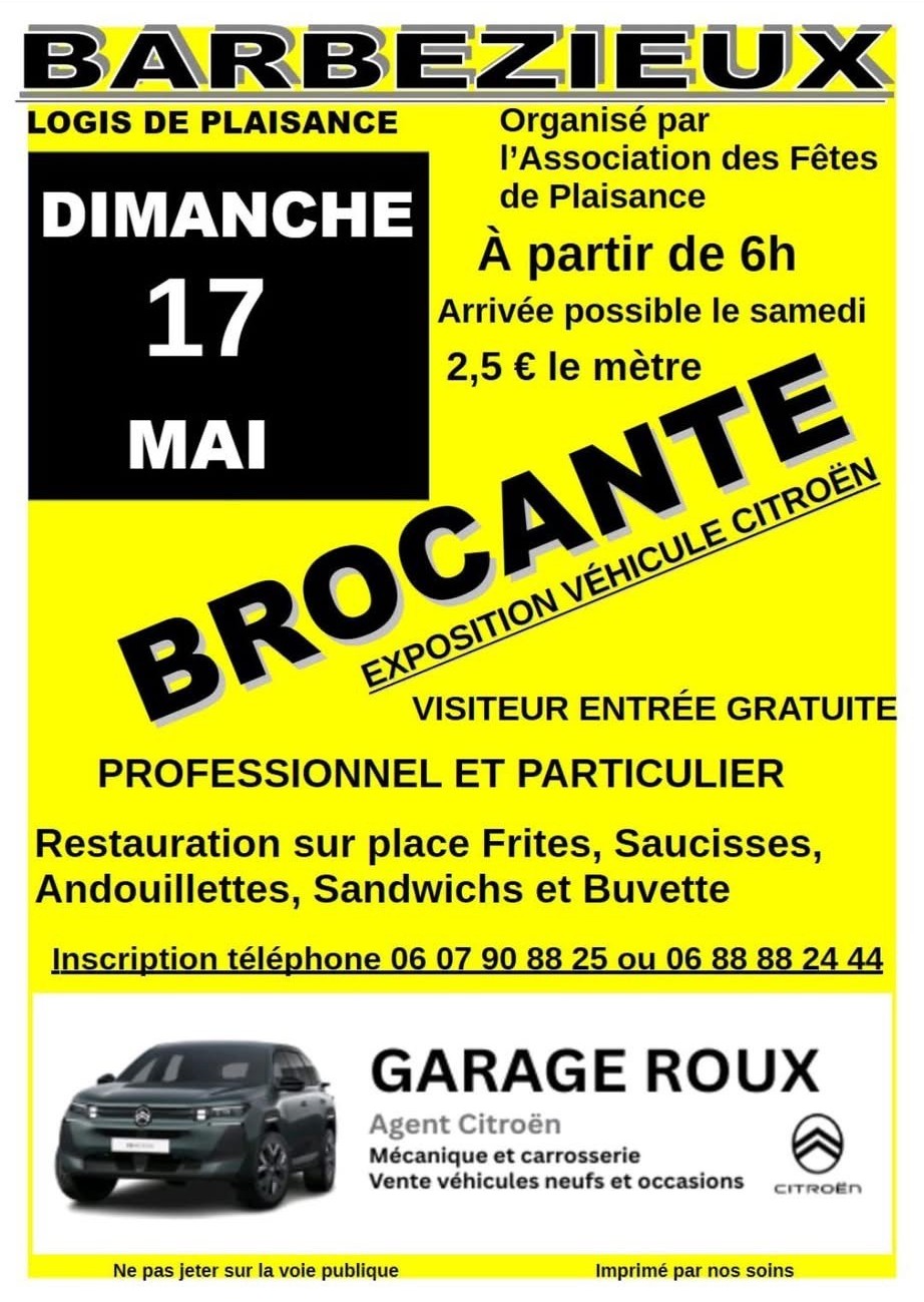Venez nombreux à la brocante organisée par l'Association des fêtes de Plaisance à Barbezieux. Exposition véhicule Citroën. Restauration sur place. Frites, saucisses, andouillettes, sandwichs et buvette. Visiteurs entrée gratuite.
