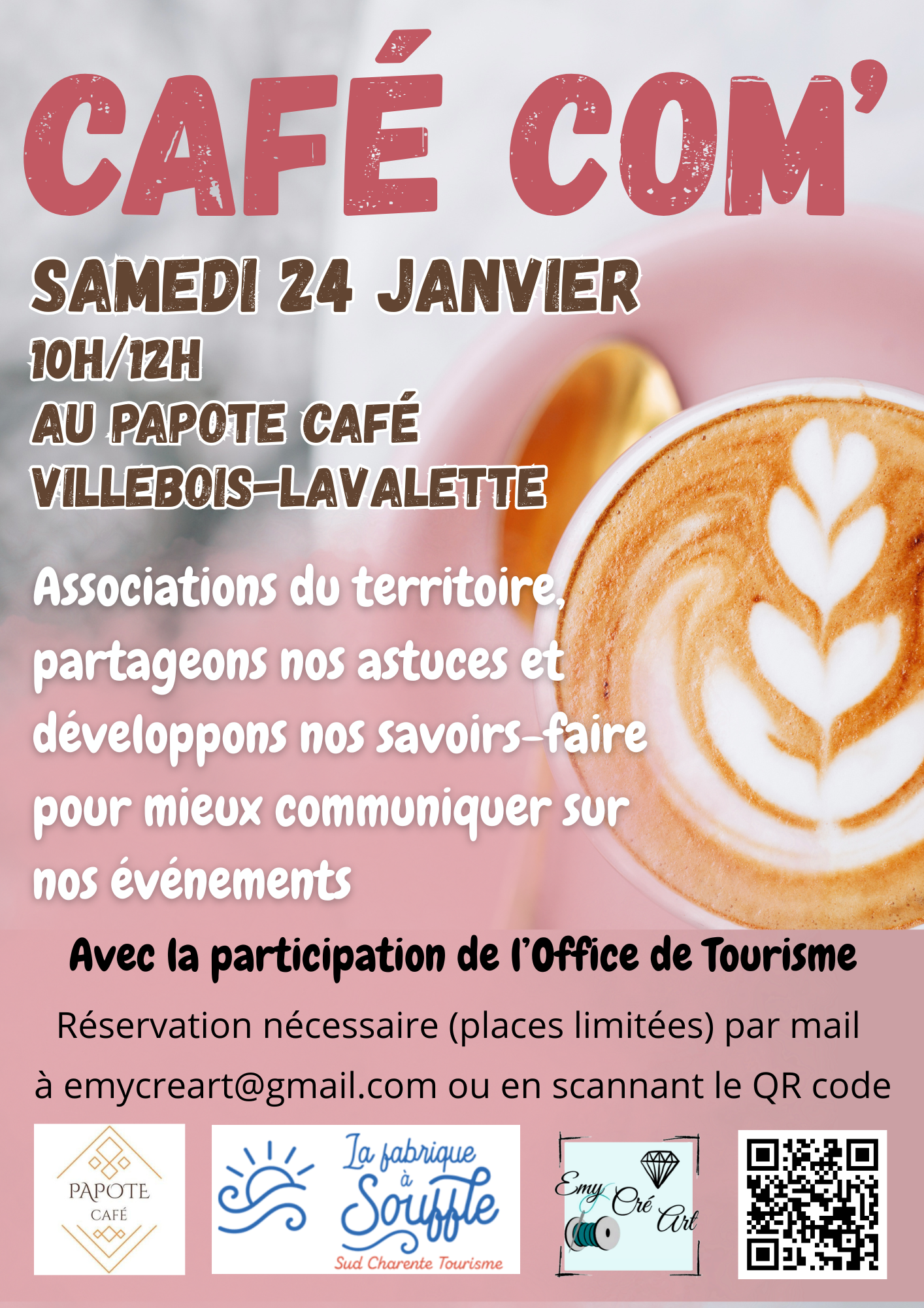 Associations du territoire, partageons nos astuces et développons nos savoirs-faire pour mieux communiquer sur nos événements! Amis acteurs associatifs, et si on faisait un petit check up des moyens et outils possibles pour communiquer sur nos événements ? Nous pourrons discuter avec Claire de l'office de tourisme, et voir ensemble les nouveaux outils numériques pour vous aider à avoir une communication efficace sans stress. L'atelier est gratuit. Il est nécessaire de réserver par téléphone, par e-mail ou, de préférence, en saisissant vos coordonnées dans ce lien de réservation : https://docs.google.com/forms/d/e/1FAIpQLSfvUFV5tTd9ugbQHwLWrm-Lbh9NkZYlG6hNtXsQBbB9BskkbQ/viewform?usp=sharing&ouid=103074203268880287675