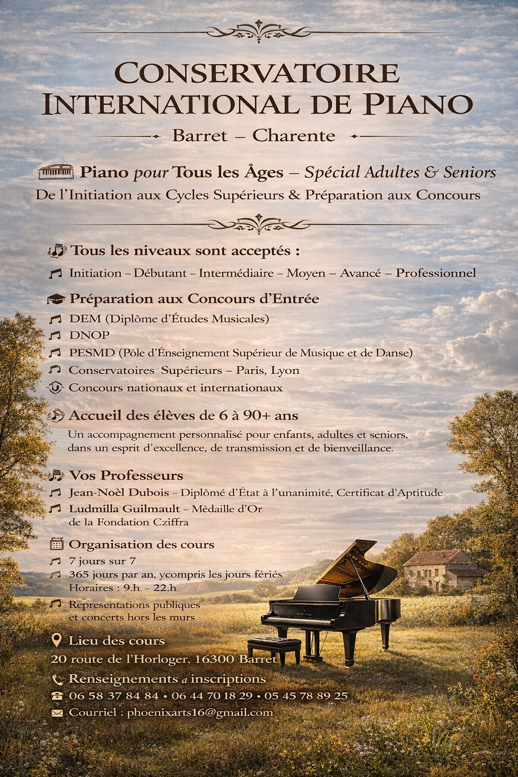 Le Conservatoire International de Piano a ouvert ses portes à Barret à partir du 1 er Mars 2026. Piano pour tous les âges – Spécial Adultes & Seniors Notre établissement propose un enseignement individualisé, accessible à tous les niveaux, de l’initiation aux cycles supérieurs, dans un cadre bienveillant et exigeant. L’inscription implique l’adhésion au règlement intérieur, comprenant l’assiduité, le respect des horaires et du matériel, ainsi qu’un travail personnel régulier. Renseignements et modalités, inscription. Portable 0658378484 e mail : phoenixarts16@gmail.com