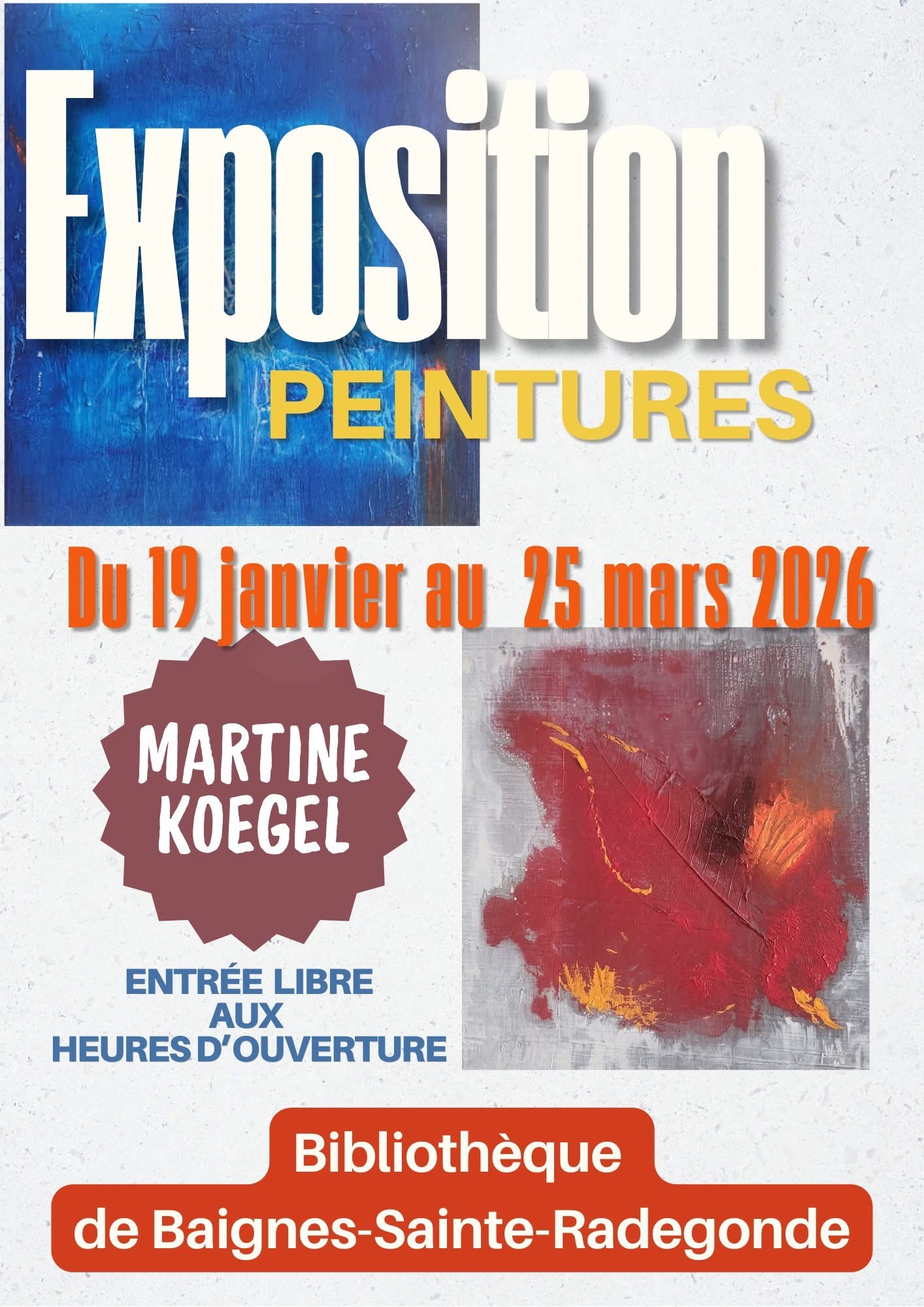 La bibliothèque de Baignes-Sainte-Radegonde a le plaisir de vous inviter à découvrir une exposition de peintures réalisées par Martine Koegel. Venez admirer la richesse et la diversité de la création artistique locale à travers des œuvres inspirées, colorées et pleines de vie. Une belle occasion de soutenir les talents de notre région et d’échanger autour de l’art dans un cadre convivial.