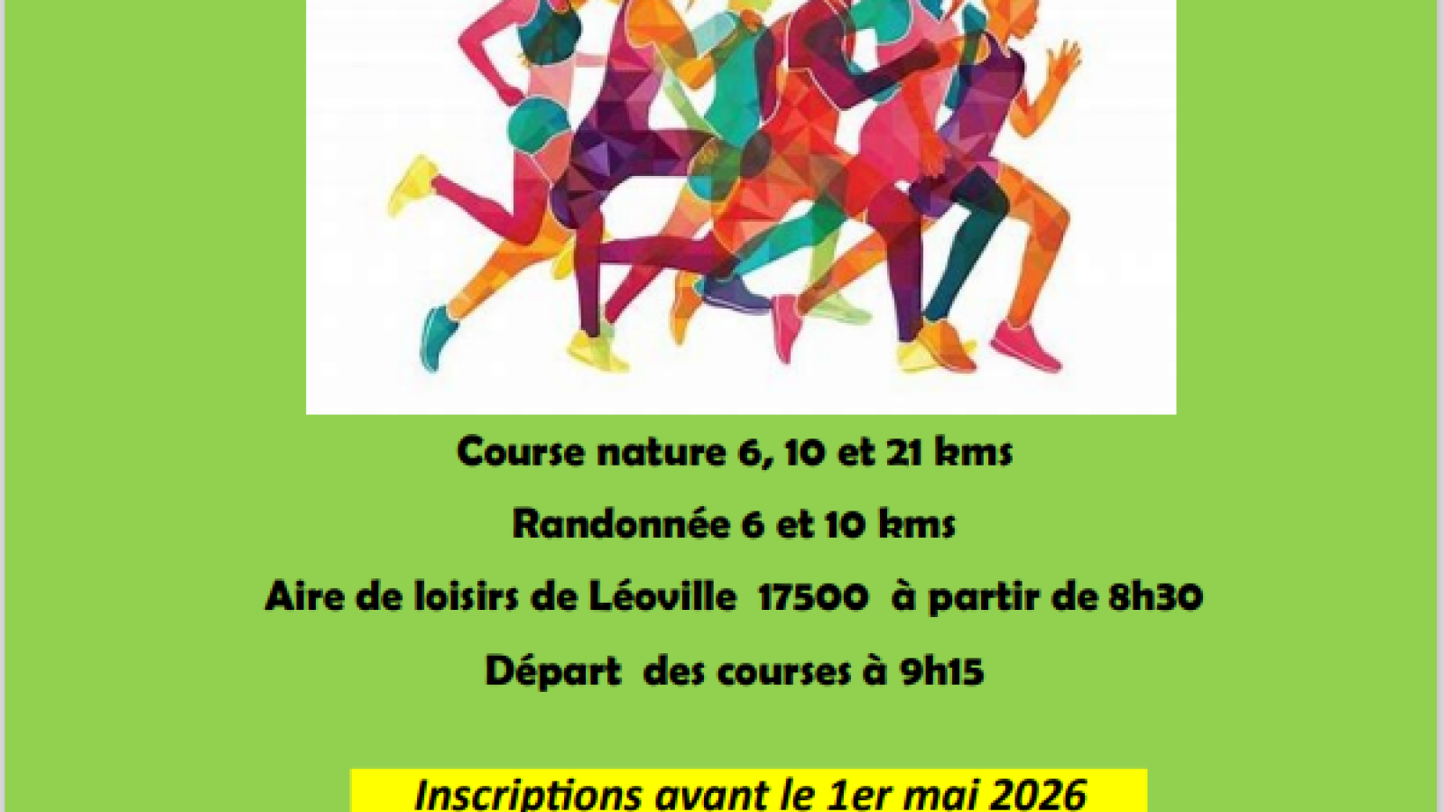 3 courses nature ( 6 kms,10 kms et 21 kms) 2 randonnées ( 6 kms et 10 kms) Réservations à la mairie, au bureau de poste ou en ligne, avant le 10 mai.