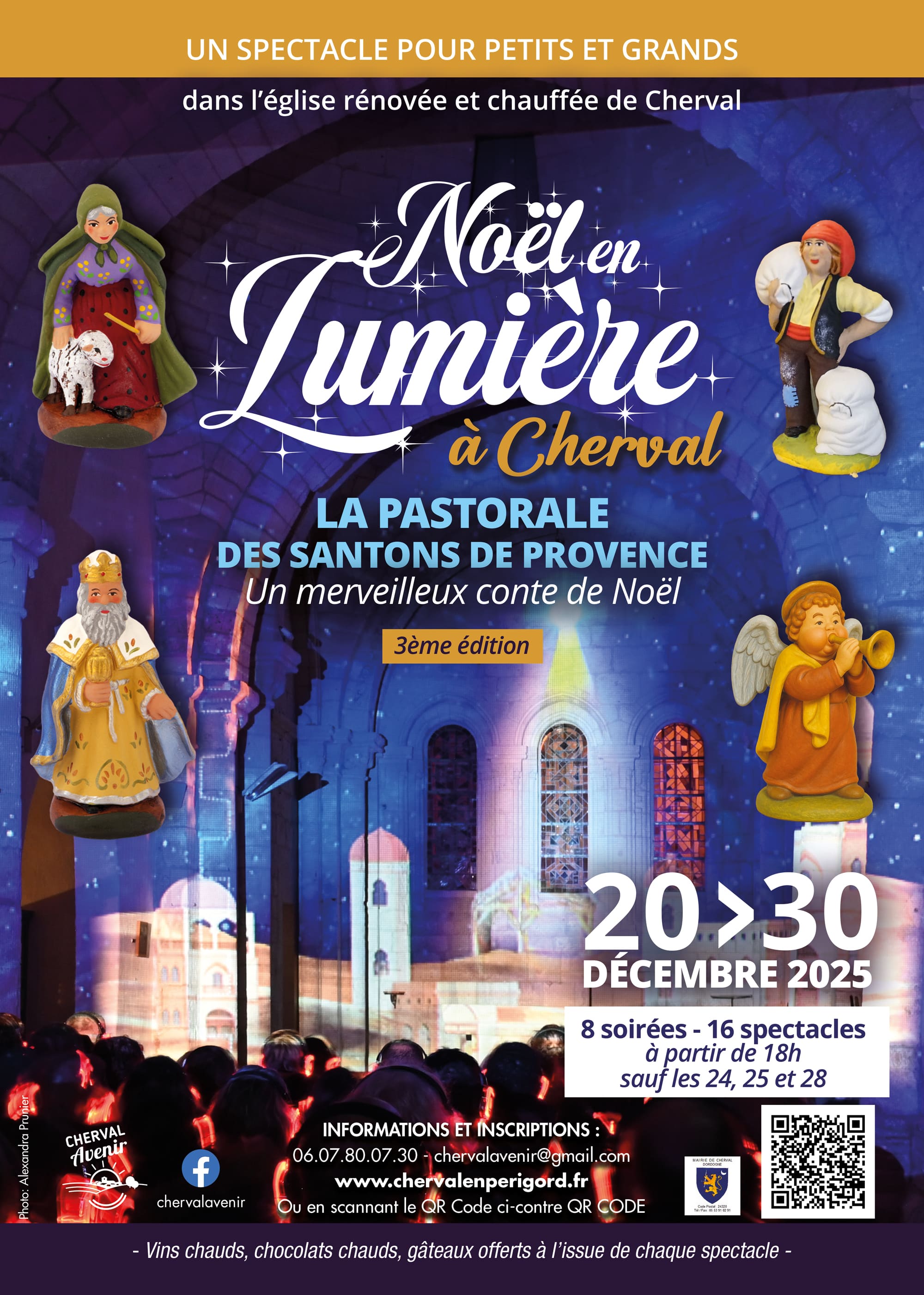 Spectacle inédits, du 20 au 30 décembre 2025 (sauf les 24, 25 et 28) soit 8 soirées à partir de 18h ou 19h. Les bénéfices éventuels contribueront à l’embellissement et à la revitalisation du village de Cherval. LA PASTORALE DES SANTONS DE PROVENCE - Un merveilleux conte de Noël. François d’Assise est considéré comme l’initiateur de la crèche chrétienne, en 1223 à Greccio (Italie), pour représenter l’histoire de la Nativité. Au 18 ème siècle, la Provence a inventé la crèche familiale et populaire avec les santons, ces petits personnages en argile représentant des métiers artisanaux et les habitants d’un village. Dans les années cinquante, Yvan Audouard a fait des santons les héros d’un merveilleux conte de Noël. En 2025, Cherval Avenir et Antoine Hospitalier ont choisi de scénariser ce très beau conte d’Audouard pour en faire un spectacle lumineux à nul autre pareil. Tout à la fois poétique, artistique et immersif, ce 3 ème Noël en Lumière va captiver petits et grands, croyants et incroyants. Grâce aux effets lumineux du mapping et aux images créées avec l’intelligence artificielle, c’est une véritable crèche vivante que vont découvrir les spectateurs. Des santons animés plus vrais que nature en sont les acteurs avec dans les rôles principaux Joseph, Marie, le petit Jésus, l’âne et le bœuf, mais aussi l’ange Boufaréou,le meunier, le bohémien, le gendarme et le riche Roustide, le pauvre jeune homme et la belle arlésienne, le berger, le ravi et l’aveugle, sans oublier les rois mages. Les voix provençales hautes en couleur, les chants, les cantiques et les farandoles créent le merveilleux. Ce nouveau son et lumière immersif enveloppera tout le chœur de l’église Saint Martin et un peu plus. Chaque spectateur disposera d’un casque audio garantissant une parfaite compréhension du récit, tout en renforçant le caractère immersif du spectacle. Par ailleurs, pour que chaque spectateur profite au mieux de l’effet immersif, le nombre de places sera limité. Pour cette raison, il y aura deux spectacles par jour, le premier à 18h et le second à 19h, soit 16 spectacles sur 8 soirées. Comme l’an passé, ce Noël en Lumière chervalais sera chaleureux et convivial. Au début comme à la fin du spectacle, les participants pourront déguster vins chauds, chocolats chauds et pâtisseries préparés par les bénévoles de Cherval Avenir ; ils pourront aussi apprécier des spécialités de nos producteurs et artisans locaux.