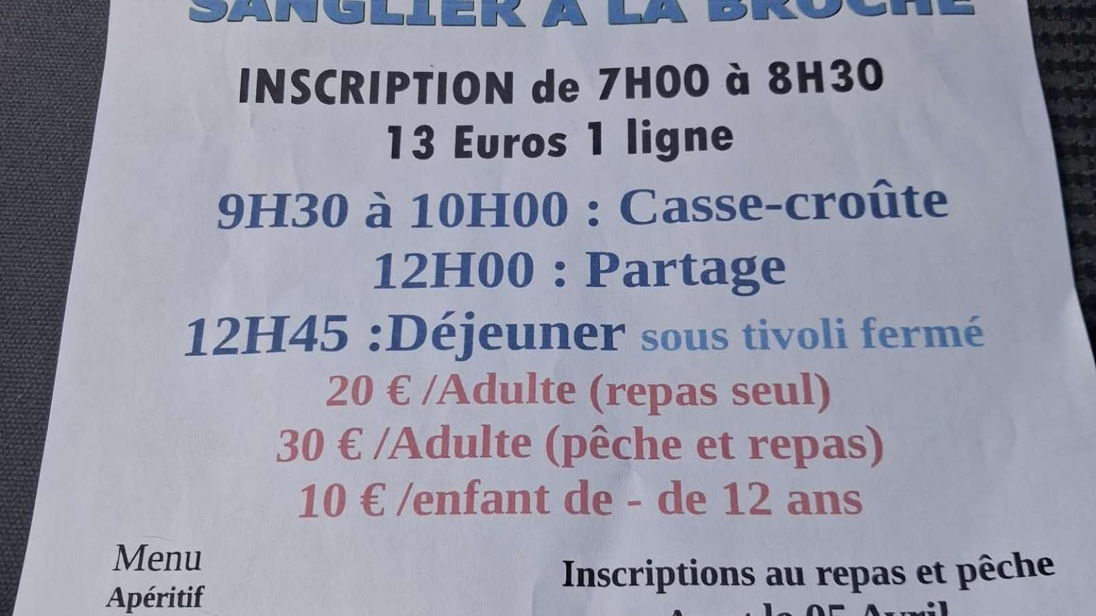 Pour ceux qui aiment la pêche à la truite, rendez vous à l'étang des Planches. 120 kg au tableau et pas besoin de carte de pêche ! Inscription de 7h00 à 8h30. - 9h30 - 10h00 : casse-croute - 12h00 : partage - 12h45 : déjeuner sous tivoli fermé (Menu: Apéritif, pâté-jambon sanglier, civet, sanglier à la broche, haricots blancs, fromage, dessert, café, vin compris) Inscription au repas et pêche par téléphone avant le 05 avril, apporter ses couverts.