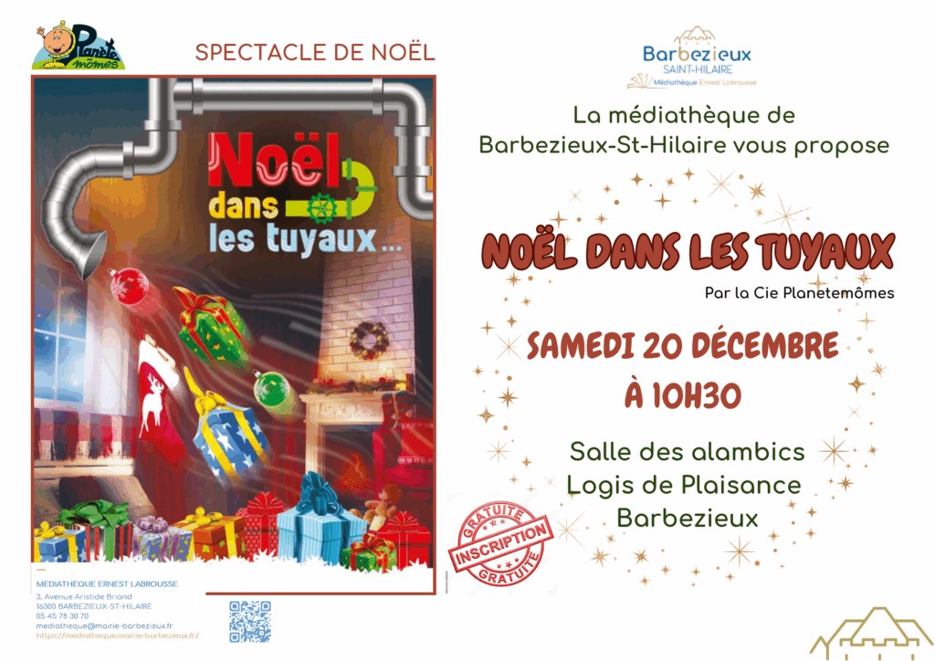Spectacle de Noël « Noël dans les tuyaux » Quelle joie de préparer, d’installer le sapin et d’illuminer toute la maison. Mais lorsque les cadeaux et les ornements disparaissent dans un mystérieux tuyau, la magie de Noël s’envole. A la recherche des décorations, les enfants du public seront les acteurs d’une folle aventure qui les fera voyager par-delà les montagnes…
