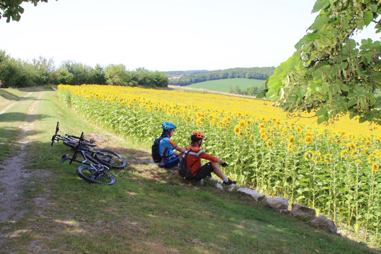 Après un passage à la collégiale de Ribérac, toujours sur les pas de Harrison Barker « Quel contraste entre le grave silence, qui régnait dans le temple, et le chant des cigales, ivres de lumière au sommet des arbres voisins », nous repartons sur des chemins qui grimpent sur les coteaux cultivés encadrant la rivière.