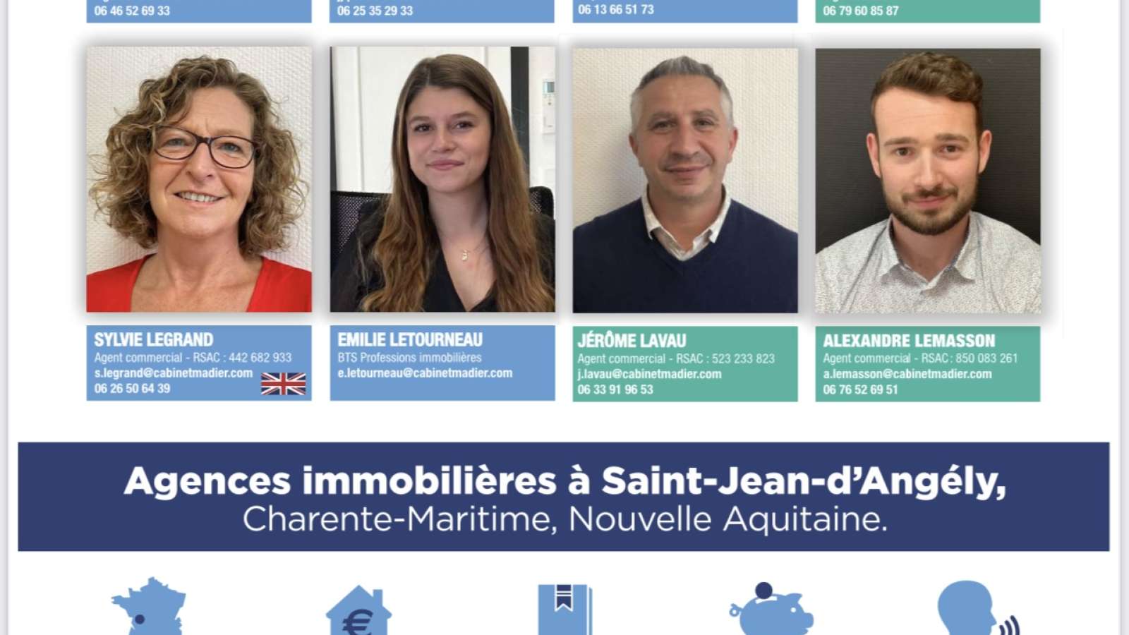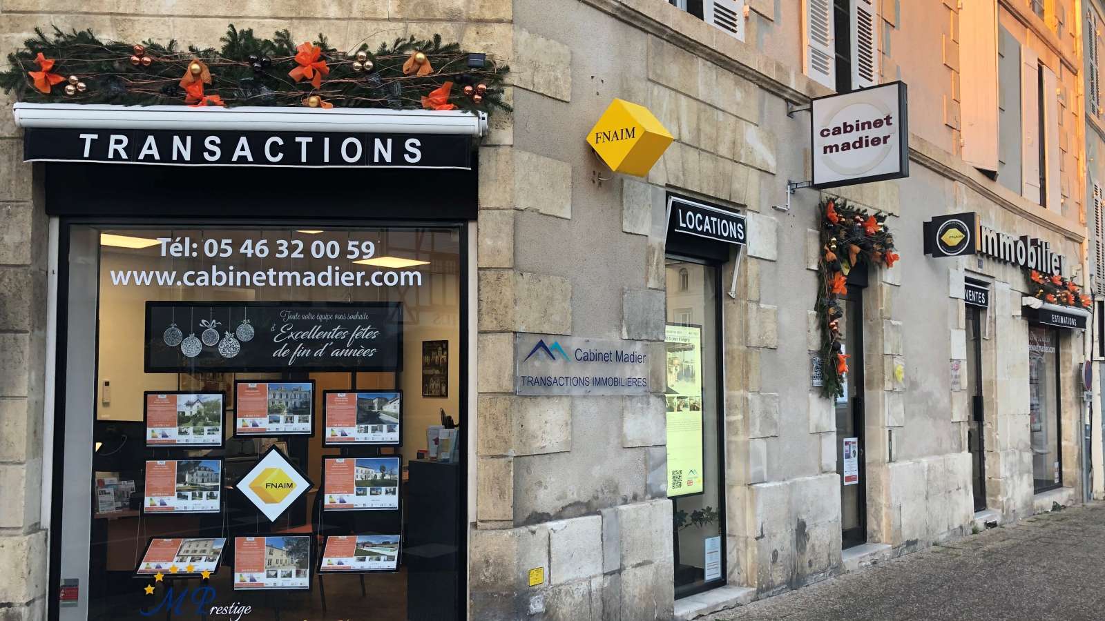 Le Cabinet Madier, adhérent à la FNAIM, est présent à Saint-Jean-d'Angély depuis 40 ans. Valérie GUIBERTEAU et ses collaborateurs vous apporterons leur expérience du marché immobilier local et vous accompagneront dans vos projets : vente, achat, location et estimation. Deux agences vous proposent un large choix de biens : maisons de prestige, de maître, logis, charentaises, propriétés anciennes et/ou rénovées avec ou sans gîtes, avec piscine, lofts, pavillons de plain-pied, neufs ou récents, sur sous-sol, maisons de ville, de bourg, de hameau, corps de ferme et garages, viager. Mais aussi des appartements, immeubles de rapport, locaux commerciaux, viager, fonds de commerce. Ainsi que des terrains à bâtir ou agricole, bois. Consulter toutes les annonces disponibles sur les sites internet : cabinetmadier.com ou madierprestige.fr