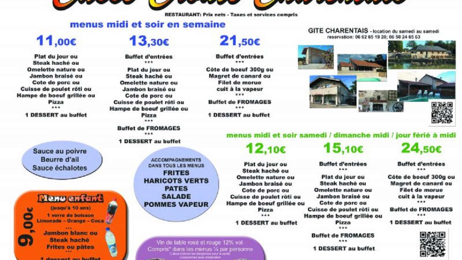 Votre restaurant Charentais offre aux routiers, ainsi qu’aux professionnels et particuliers, la possibilité de faire une pause repas ou café. Accueil de bus et collectivités possible. Au restaurant vous retrouverez de nombreux menus, dont un menu enfant (moins de 10 ans), déclinés ou non avec notre buffet proposant chaque jour des produits frais (entrées, plats, fromages, desserts).