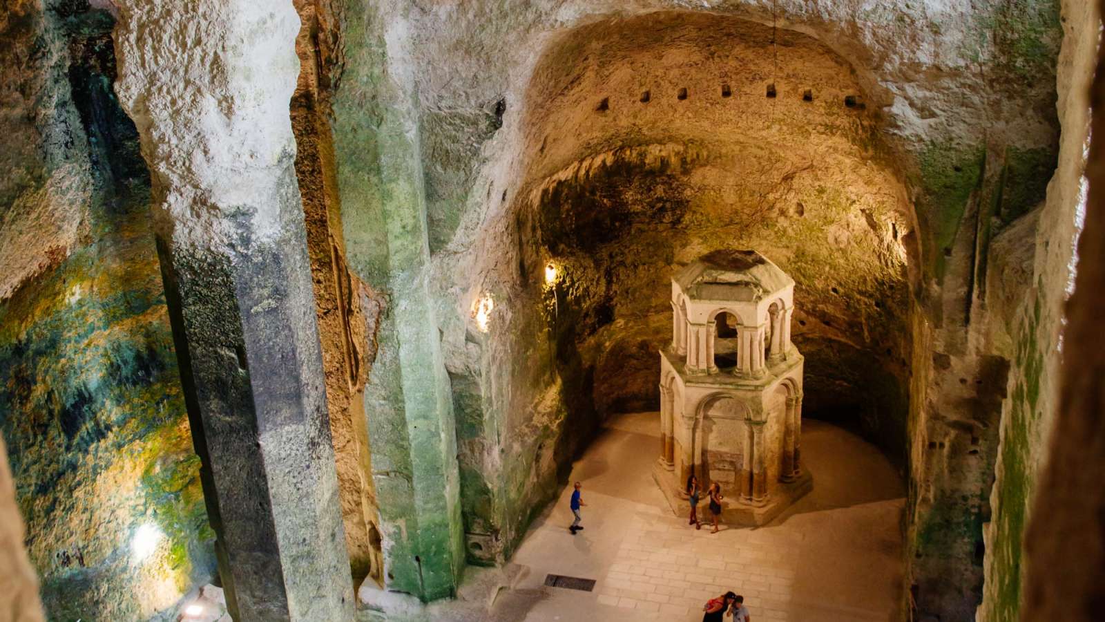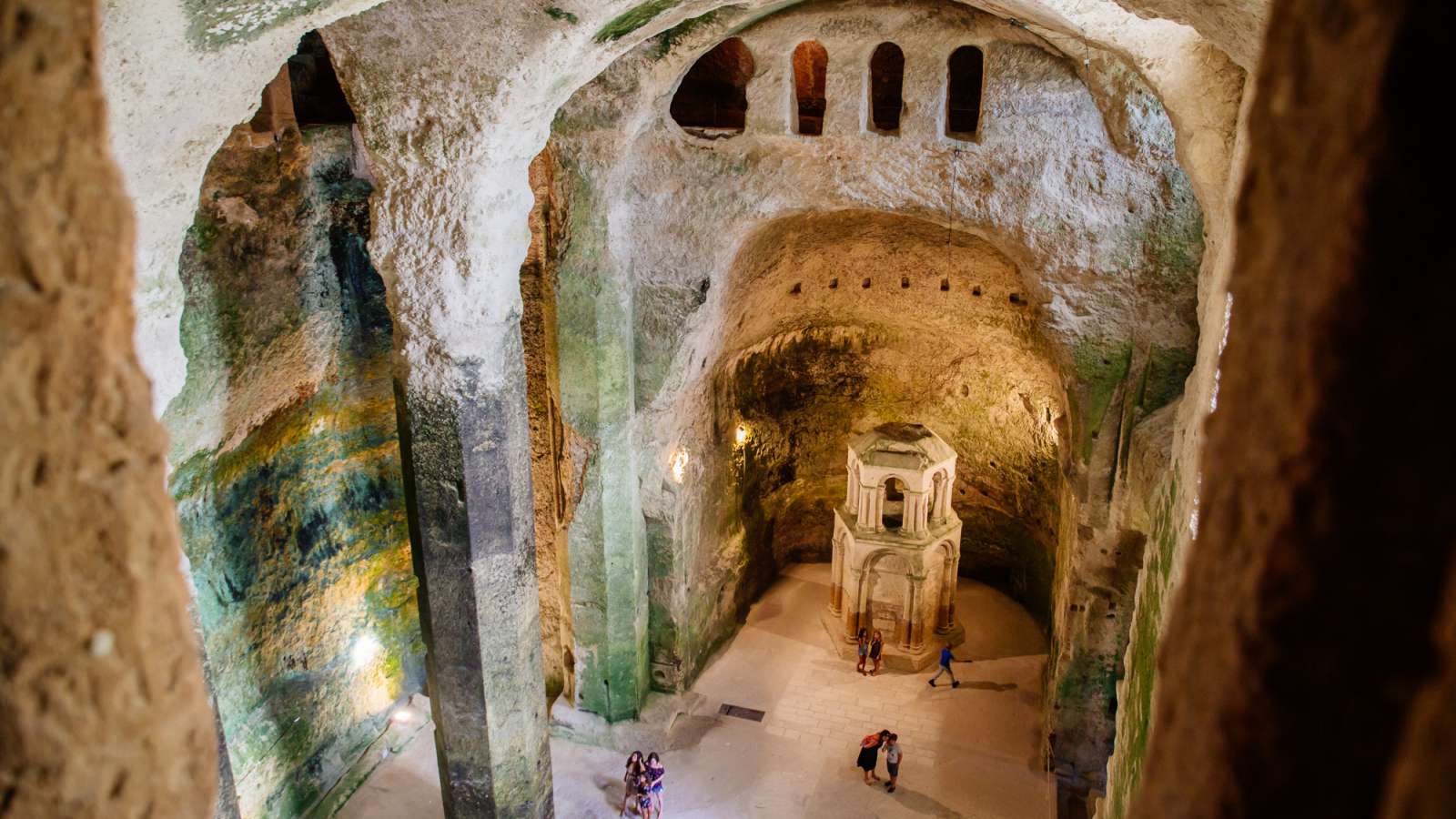 Creusée dans la roche au XIIème siècle, elle est le joyau caché du village d’Aubeterre-sur-Dronne. Dès que vous franchirez les grandes portes en bois, vous serez happé par la magie du lieu, unique en Europe. C’est Pierre de Castillon, seigneur d’Aubeterre qui serait à l'origine du projet de creusement de l'église sous son château. Un chantier monumental, 9 000m³ de pierre à retirer soit presque 3 piscines olympiques ! Au cœur de la nef subsiste une fosse centrale recélant une croix en son fond, et un reliquaire réplique du tombeau du Christ de 6 mètres de haut. Une saisissante nécropole de 170 tombes creusées et une galerie en hauteur ne manqueront pas de vous étonner encore une fois.