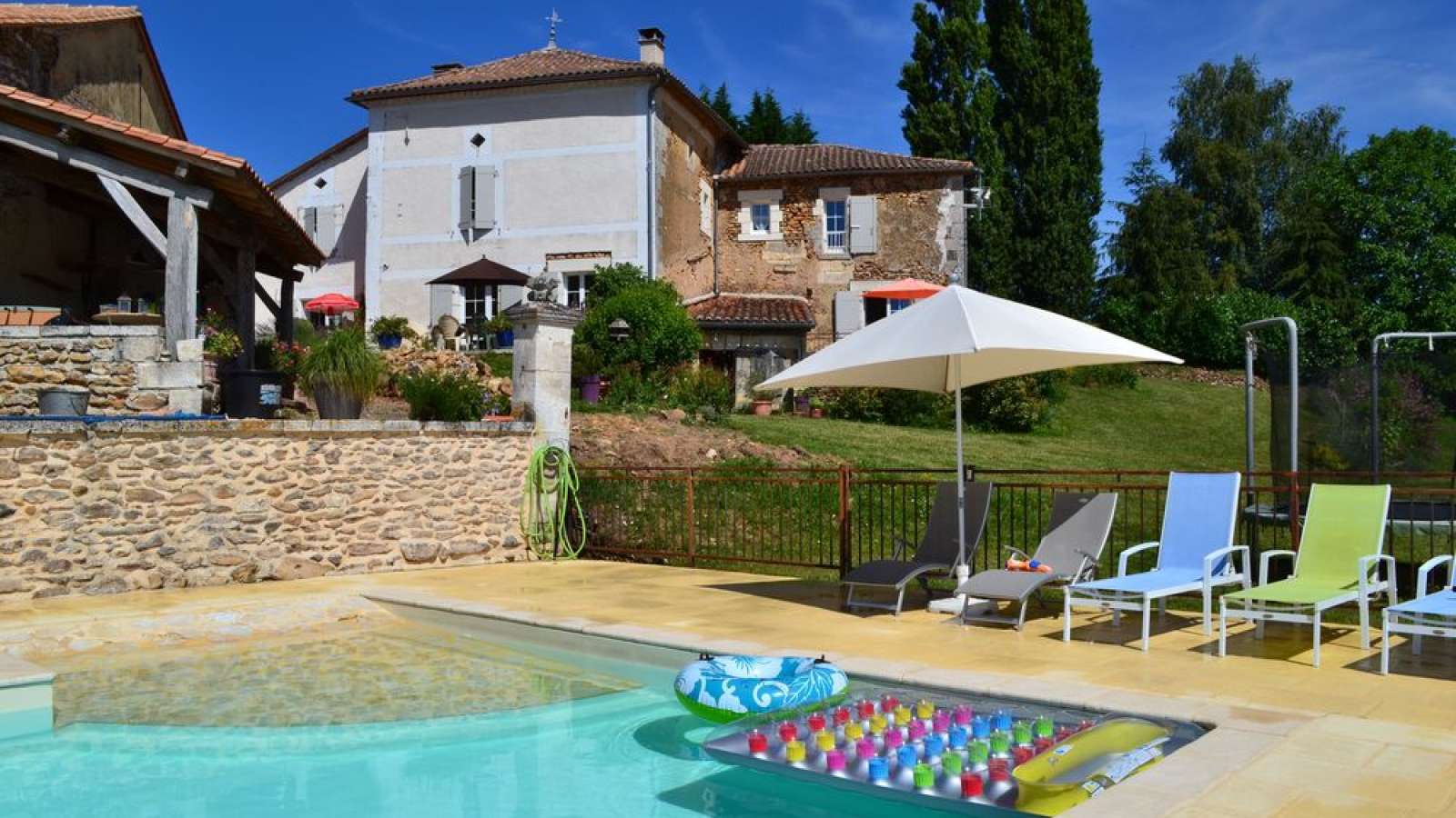 Dans un hameau proche de la Dordogne, gîte attenant à la maison du propriétaire, aménagé dans une maison ancienne avec vue sur la campagne. Rez-de-chaussée : séjour avec cuisine, wc. Etage : une chambre avec 1 lit 140, une chambre avec 2 lits 90 ou 1 lit 180, salle d'eau avec wc. Terrasse, jardin privatif, piscine (10 x 5 m) ouverte de mai à septembre, à partager avec les propriétaires, trampoline, portique. Draps, linge de toilette et de cuisine fournis. Lit bébé et chaise haute à disposition.
