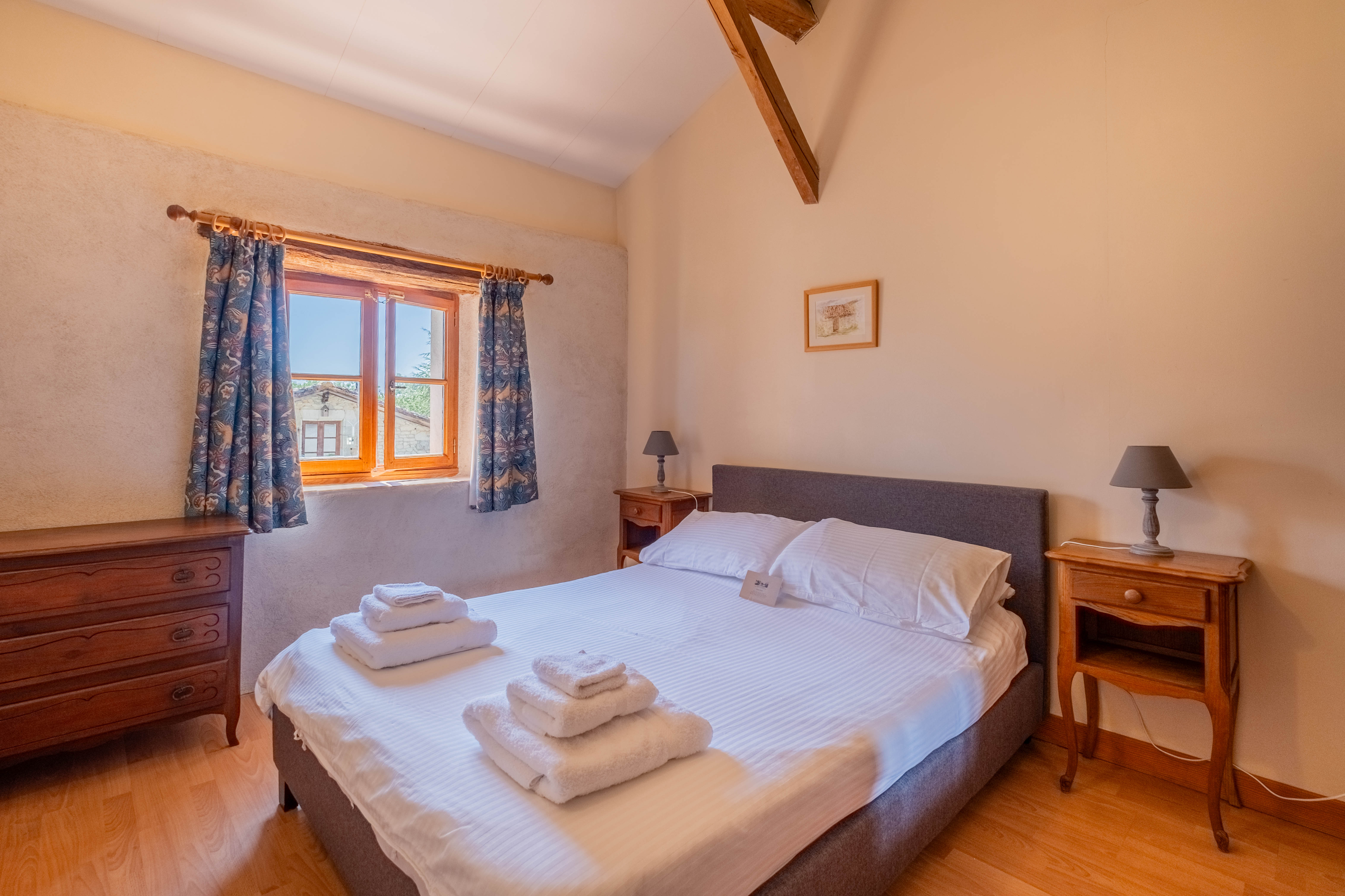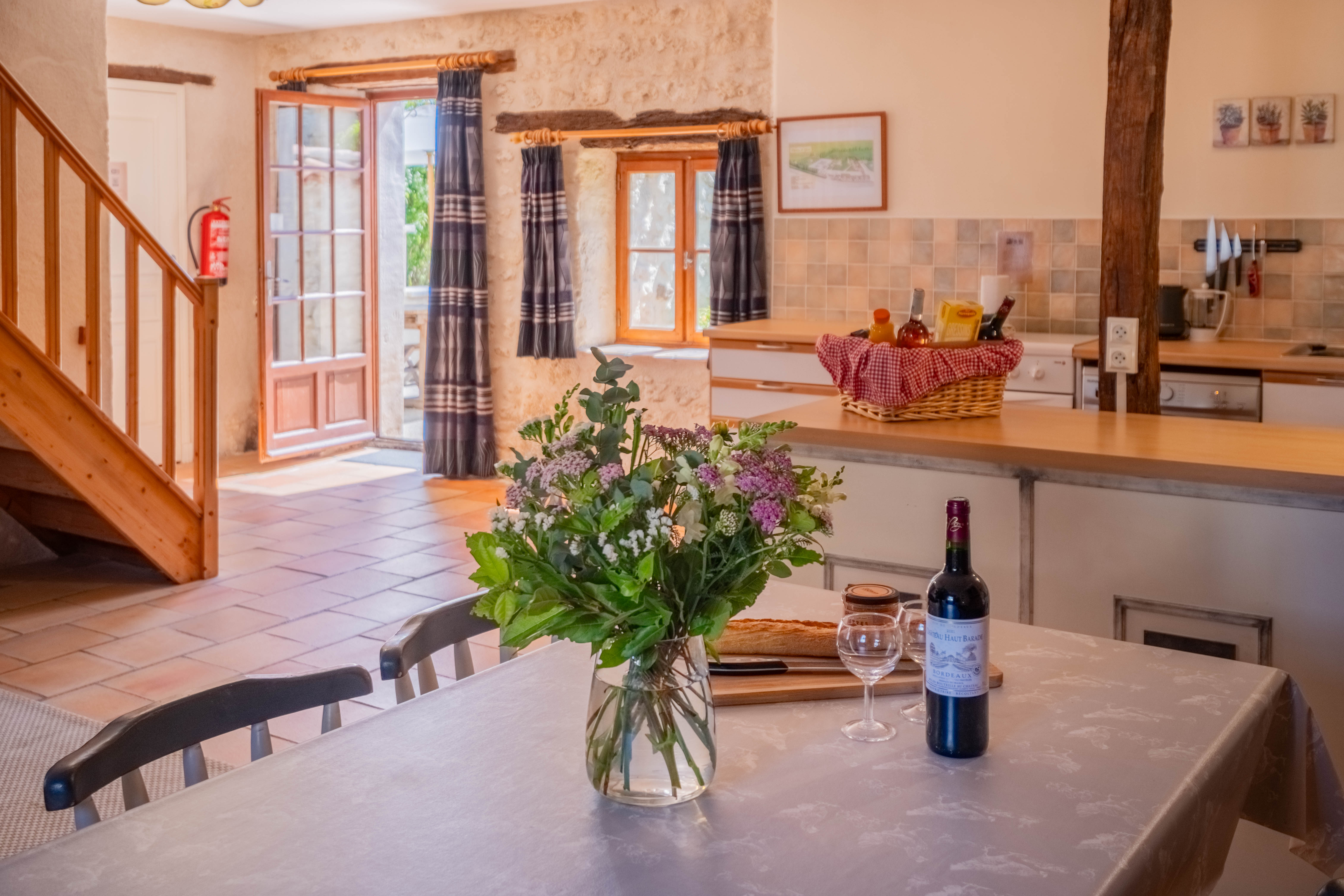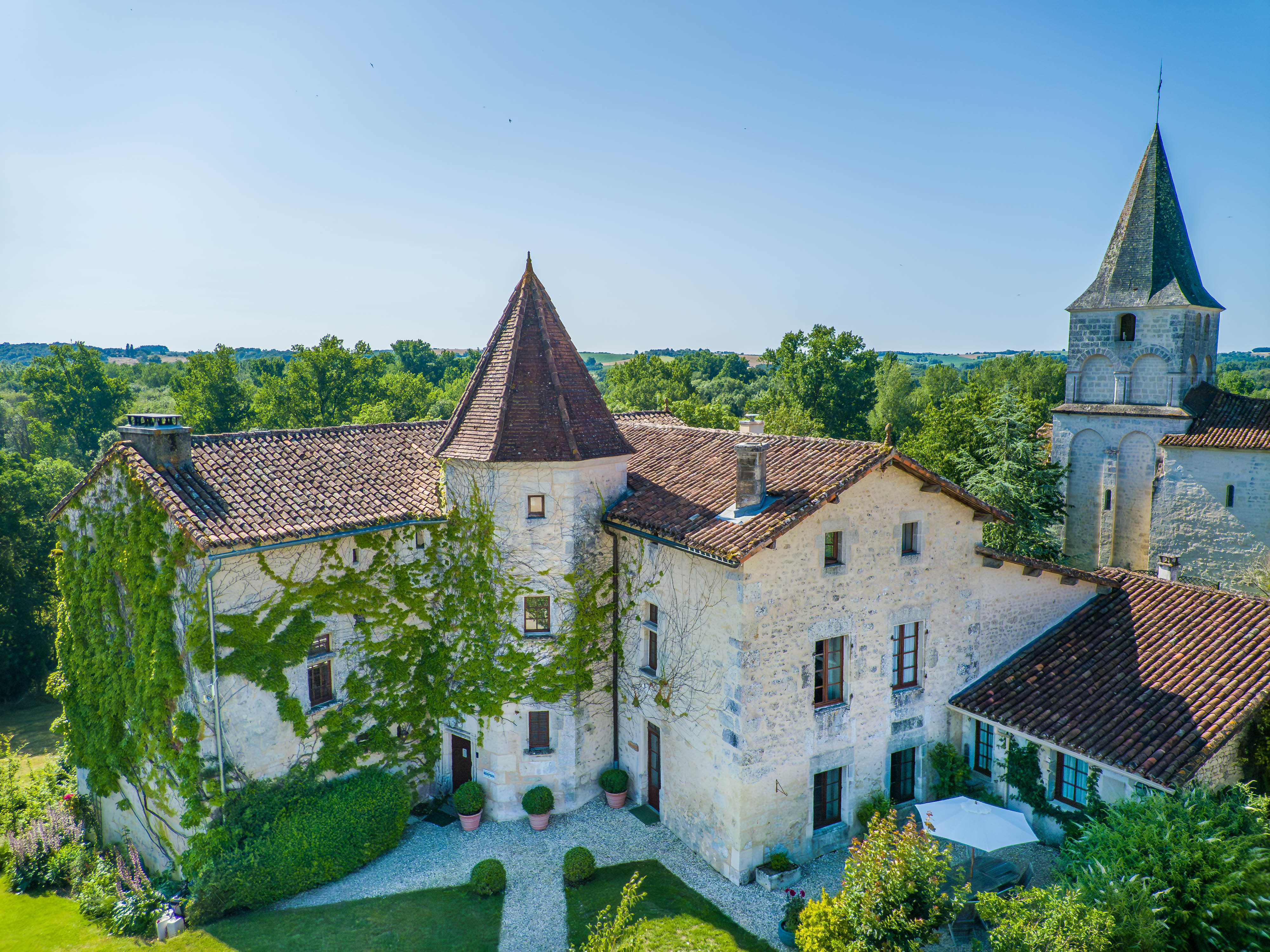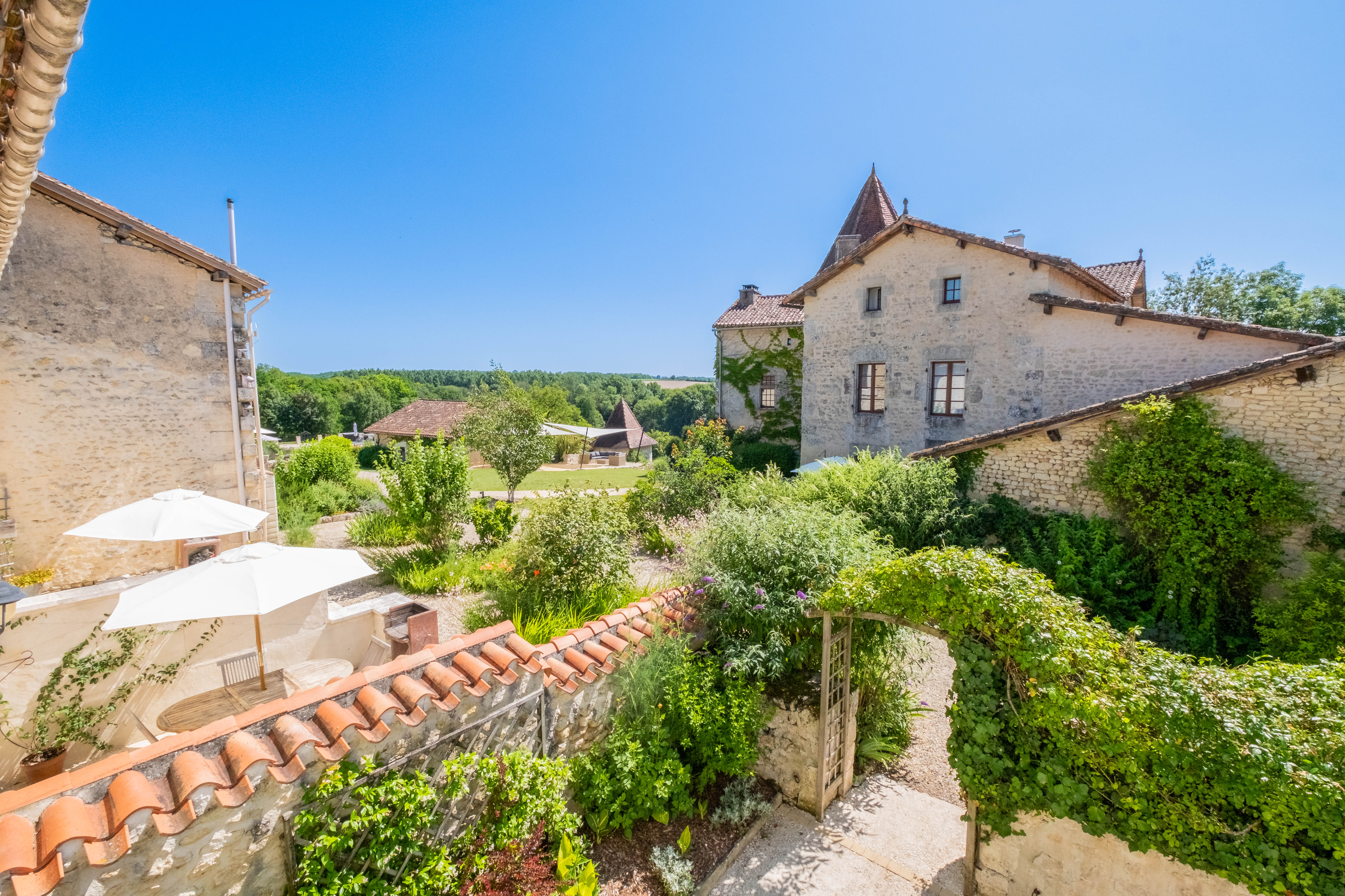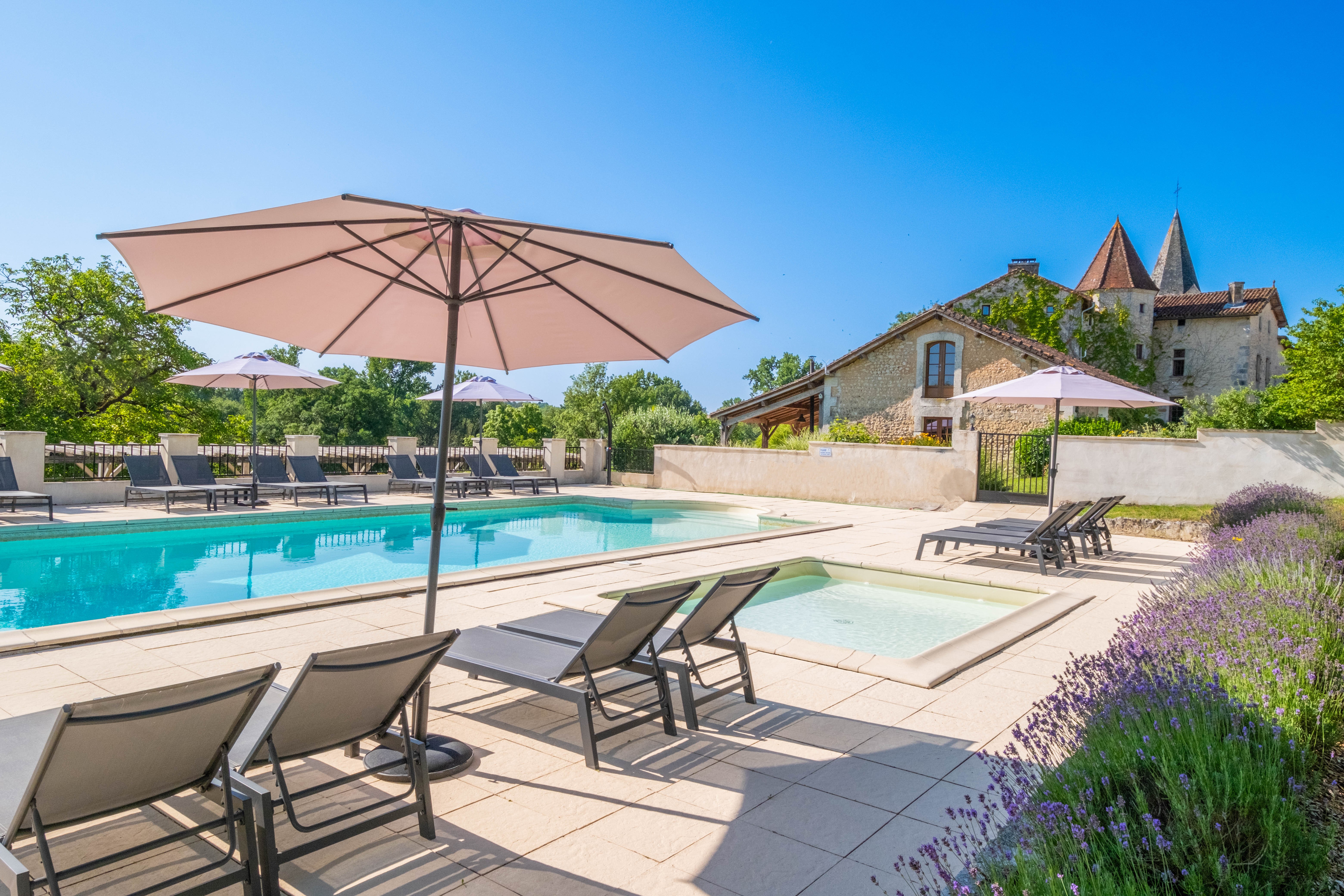 Aux portes du Périgord, nichée entre le charmant et paisible village de Gurat et 14 hectares de bois et prairies, le Château de Gurat propose 6 gîtes avec piscine et bassin séparé pour les petits. Il y amples possibilités pour amuser les enfants de tout âge avec un bac à sable géant, trampoline, balançoires, et dans la grange rénovée toutes sortes de jouets, jeux et livres, DVD, un baby foot et table de ping-pong. Il y aussi la rencontre avec les animaux (cochons d’Inde, moutons, chèvres, poules), les promenades dans la campagne et la visite de la Charente et de la Dordogne. Le Mas Provençal - Avec une vue imprenable sur les jardins, le bac à sable et le parc. C'est un endroit idéal si vous voulez vous asseoir sur la terrasse avec un bon livre et un verre de Bordeaux, tout en gardant un œil sur les enfants qui jouent. Voir la photo dans la galerie ci-dessous des vues du coin de la terrasse sur le paysage vers le bac à sable et le parc. Surface habitable de 77m2 au total.