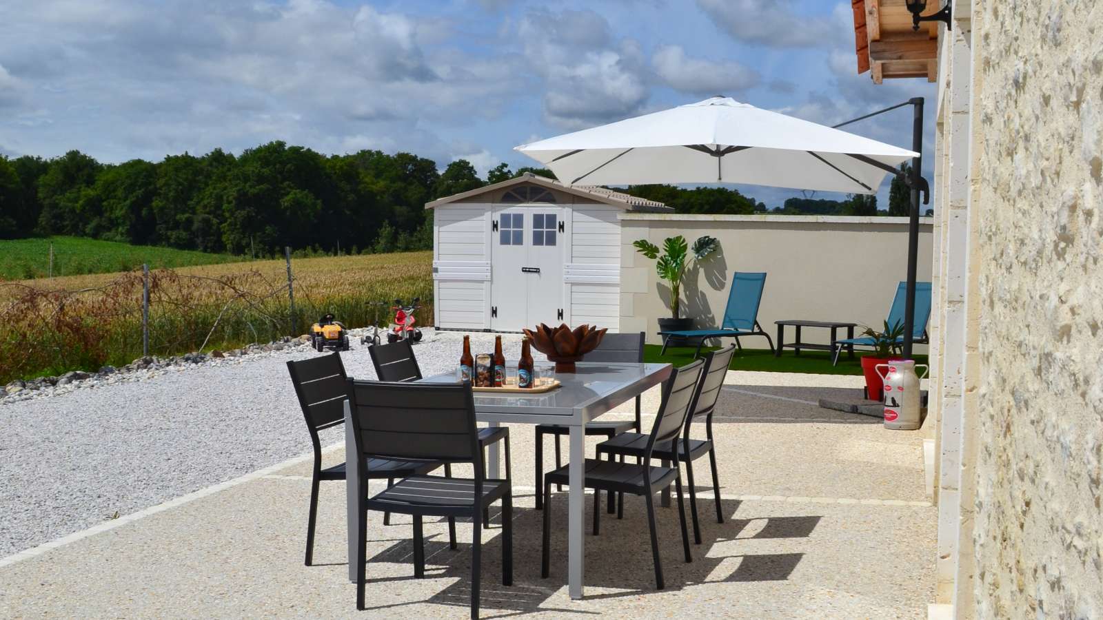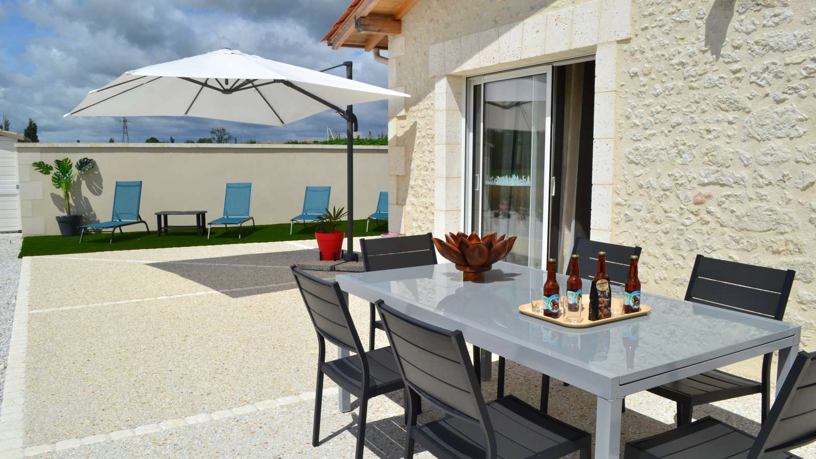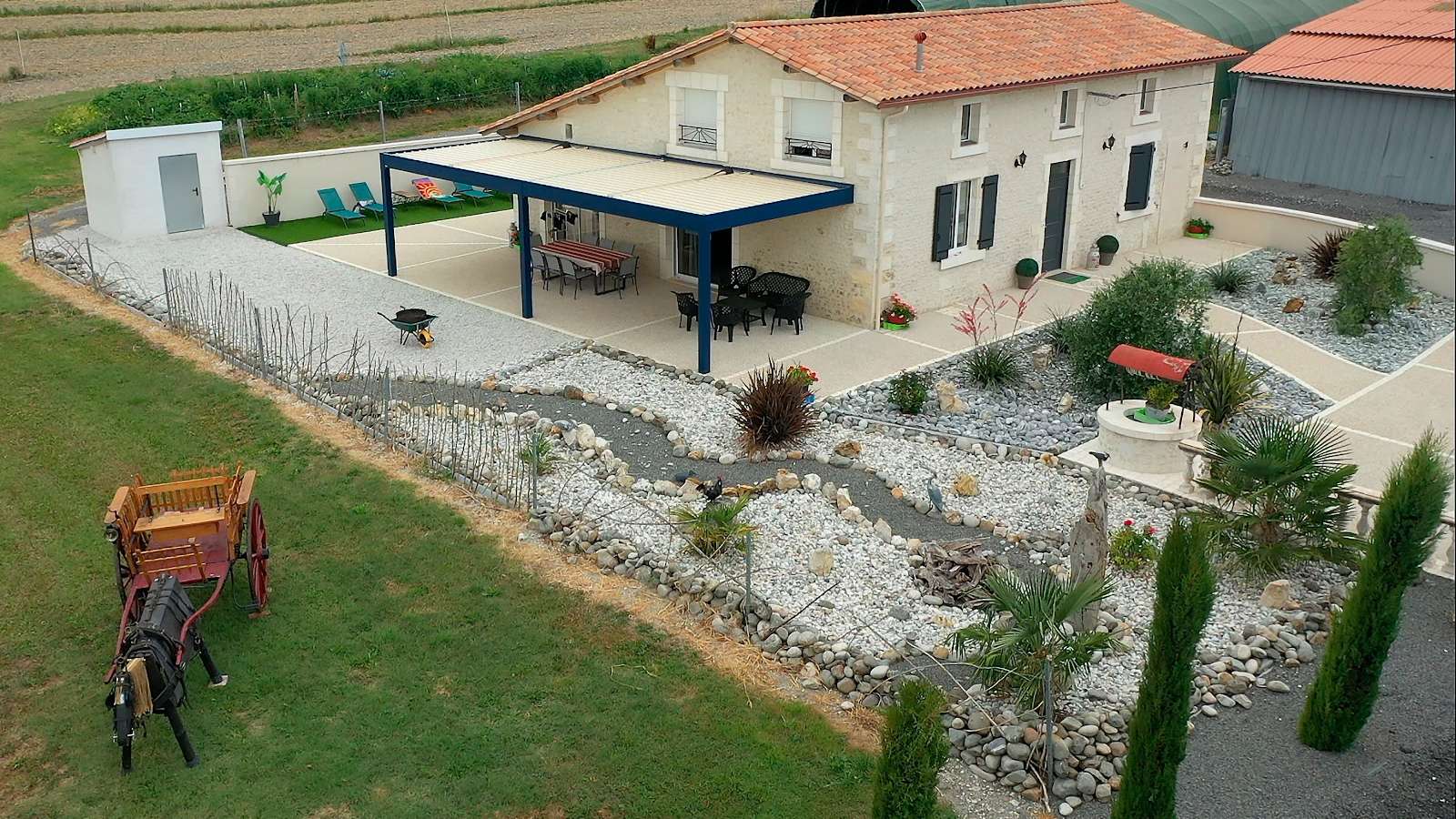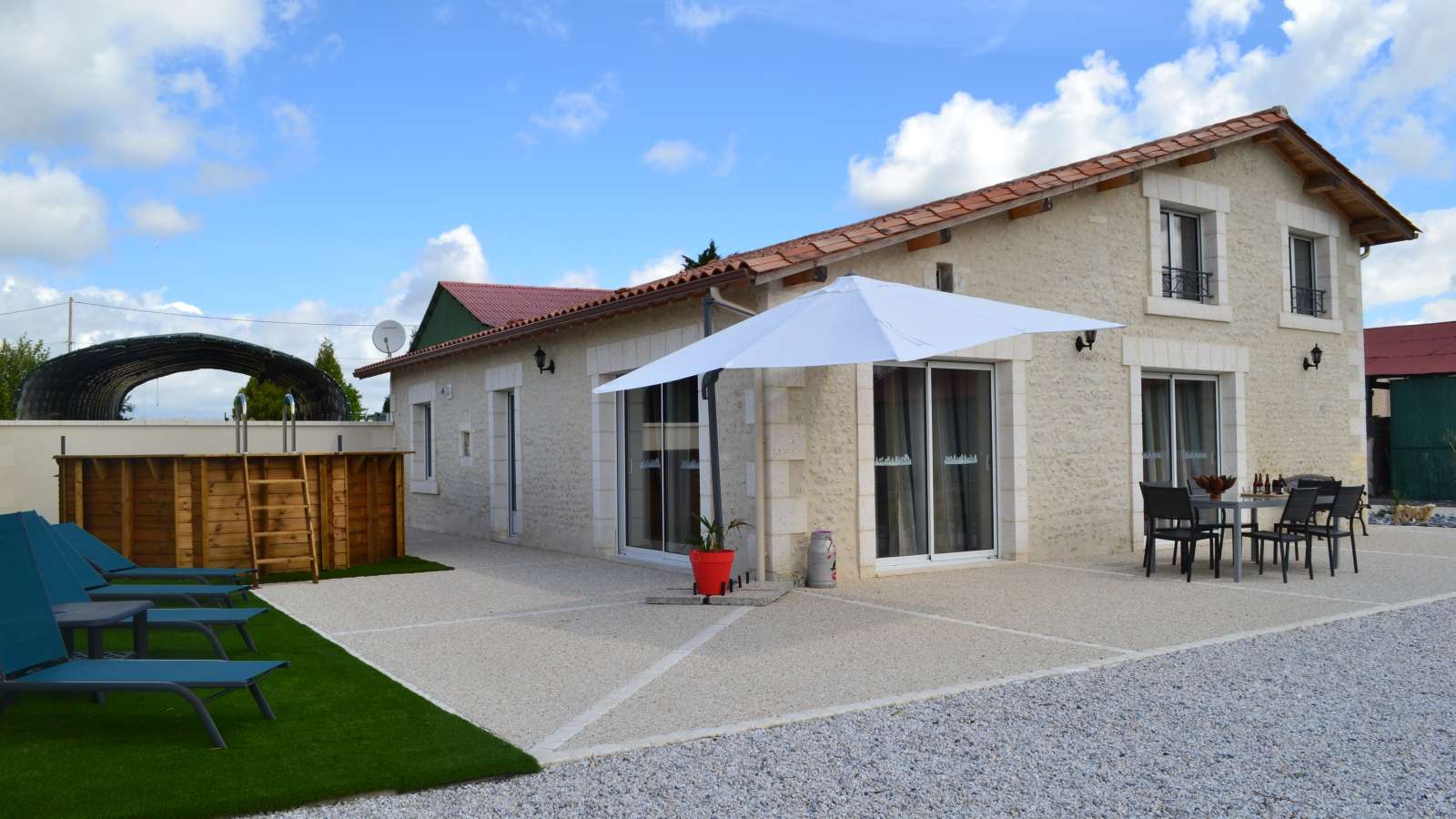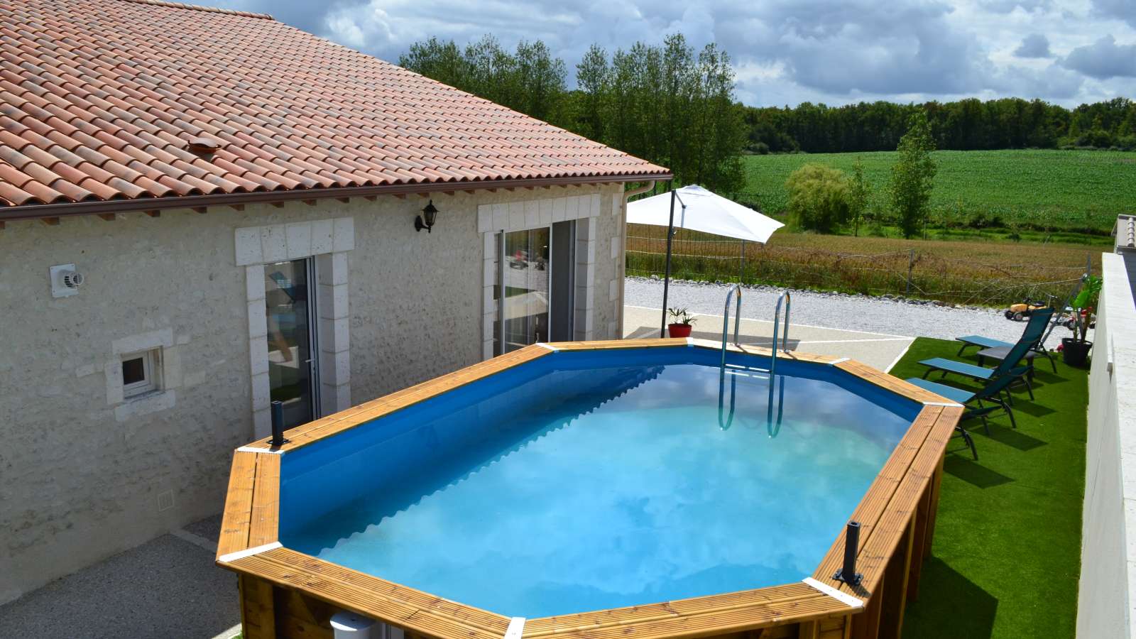 Ancienne maison charentaise entièrement rénovée avec pierres apparentes, spacieuse et confortable, offrant une vue dégagée sur le paysage. Maison indépendante située à proximité de la maison des propriétaires. Rez-de-chaussée : séjour avec coin cuisine et coin salon, wc avec buanderie, 1 chambre avec 1 lit 140, 1 chambre avec 1 lit 140 et salle d'eau et wc privés. A l'étage : une grande mezzanine, 1 salle d'eau avec wc, 2 chambres avec chacune 2 lits 80 x 190 (jumelables en 160). Espace privé de 500 m², terrasse découverte de 100 m², piscine hors-sol privative (4x6 m, 30 m², 1m30 de profondeur, ouverte du 1 er juin au 3 septembre). Plancha. Draps, linge de toilette, linge de cuisine fournis. Lits faits à l'arrivée. Sur place, vente directe de produits fermiers (volailles). 2 étangs privés à 100 m du gîte (1500 et 2000 m²). Parking.