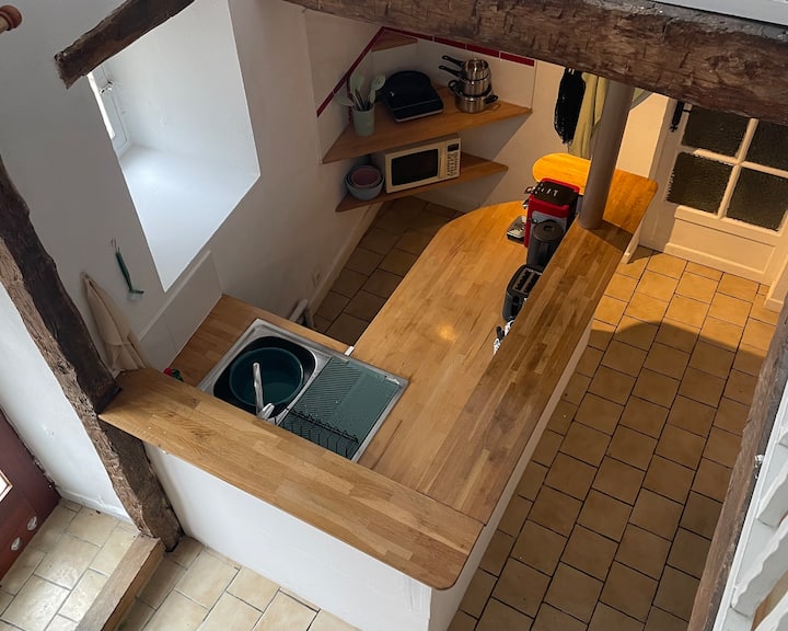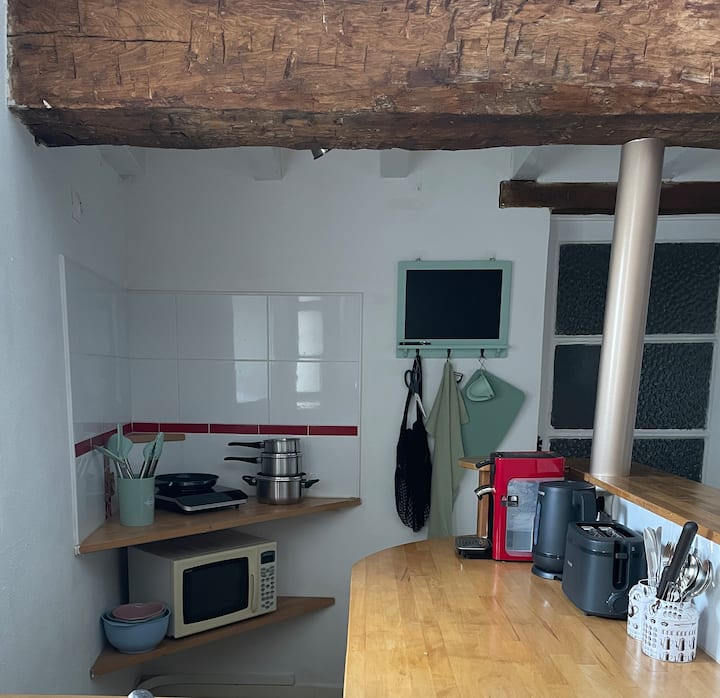 L'appartement de deux étages dispose d'un espace ouvert pour cuisiner, manger et se détendre. La cuisine est compacte mais bien équipée avec bouilloire, grille-pain, cafetière Sensio.