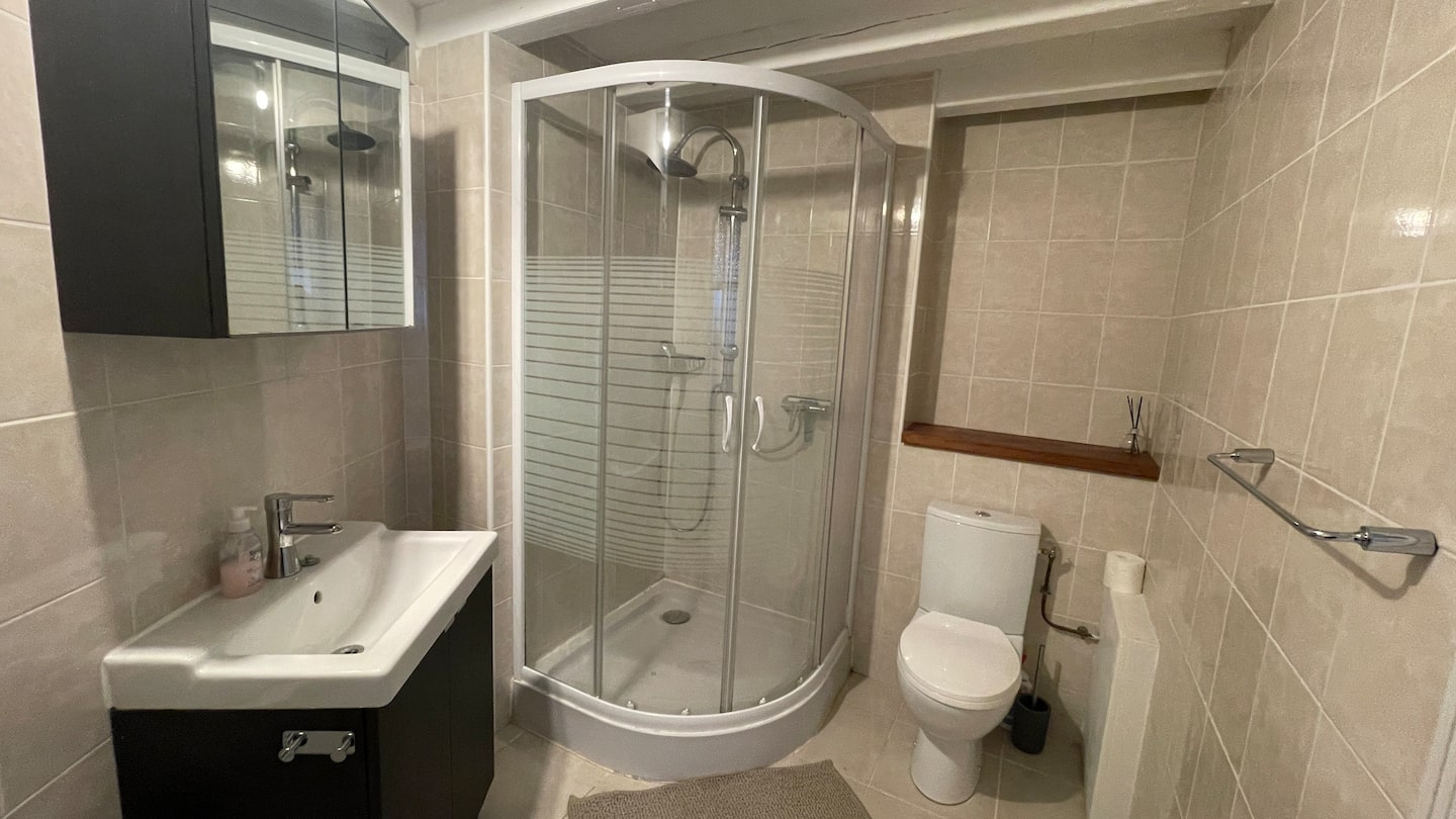 Micro-ondes/grill. Plaque de cuisson à induction. Au rez-de-chaussée, vous disposez également d'une salle de douche spacieuse. À l'étage, il y a deux chambres, un lit Queen size sur la mezzanine et une chambre séparée avec un lit double. Accès des voyageurs
