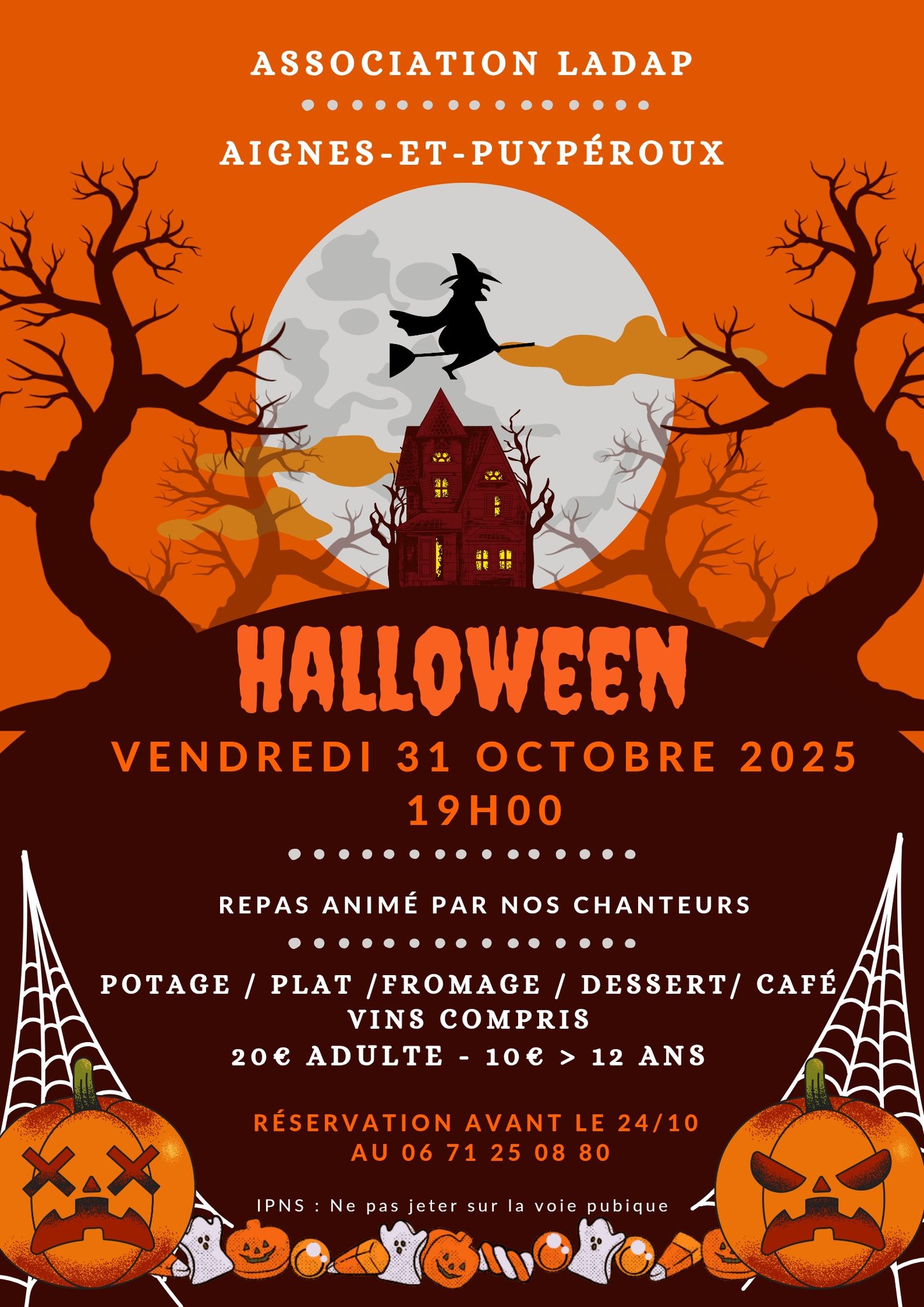Dîner et spectacle pour Halloween ! Repas animé pas nos chanteurs! Potage - Plat - Fromage - Dessert - Café - Vin compris. Réservation avant le 24/10.