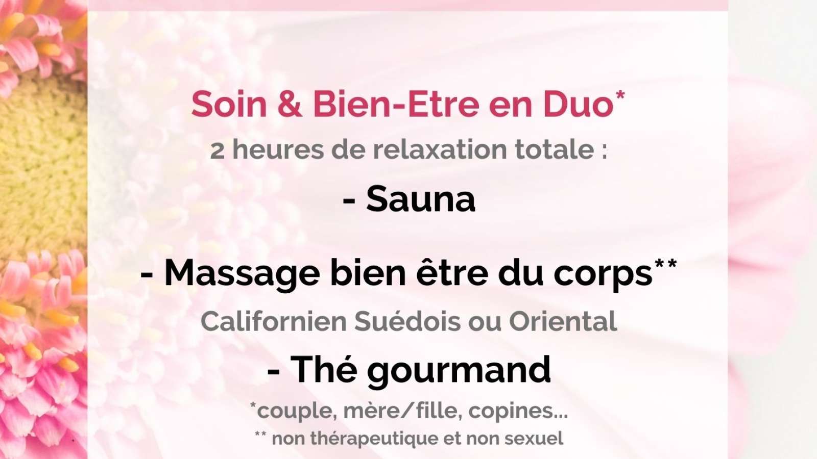 Une bulle de douceur dans un espace privatif pour des massages* bien-être Kaïna.Reflexo vous accueille dans le respect des gestes sanitaires pour des massages* bien-être en individuel ou en duo (non sexuels et non thérapeutiques) *Massages et bien-être en individuels (avec ou sans sauna) : Réflexologie plantaire ou abdominale, massages bien-être (dos ou ventre, ou drainage lymphatique, ou massage du corps, massage ayurvédique des pieds, massage des muscles profonds) *Massages et bien-être en duo (sur demande préalable afin de réunir les 2 masseuses) 2 heures de prestations qui comprennent sauna + massage bien être du corps + thé gourmand. Si sauna non souhaité nous remplaçons par plus de massage