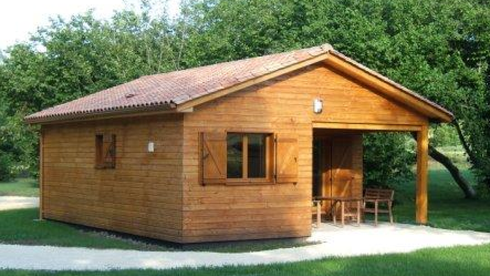 Location de chalet composé de deux chambres, d'une cuisine équipée, d'un séjour, d'une salle d'eau avec douche et Wc et d'une terrasse avec salon de jardin donnant sur le parc. La capacité d'accueil est de 4 personnes (maximum 6 personnes).
