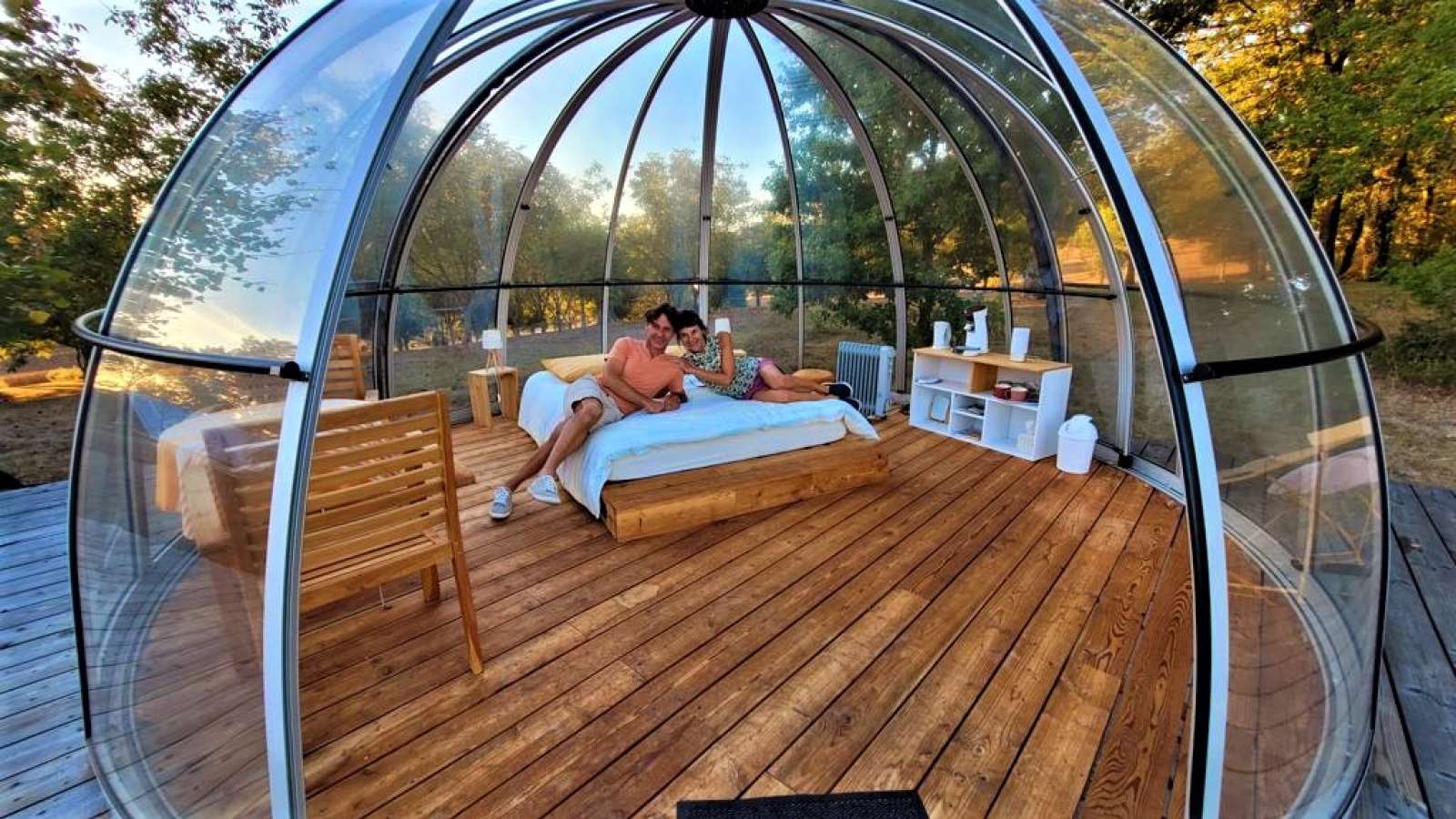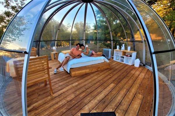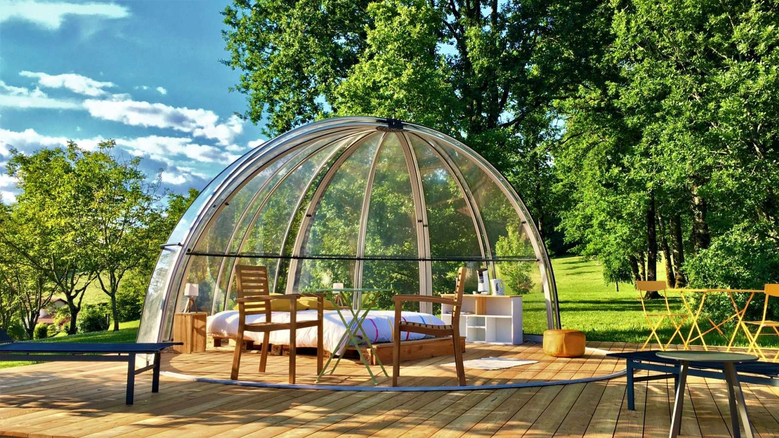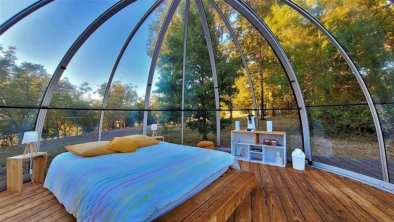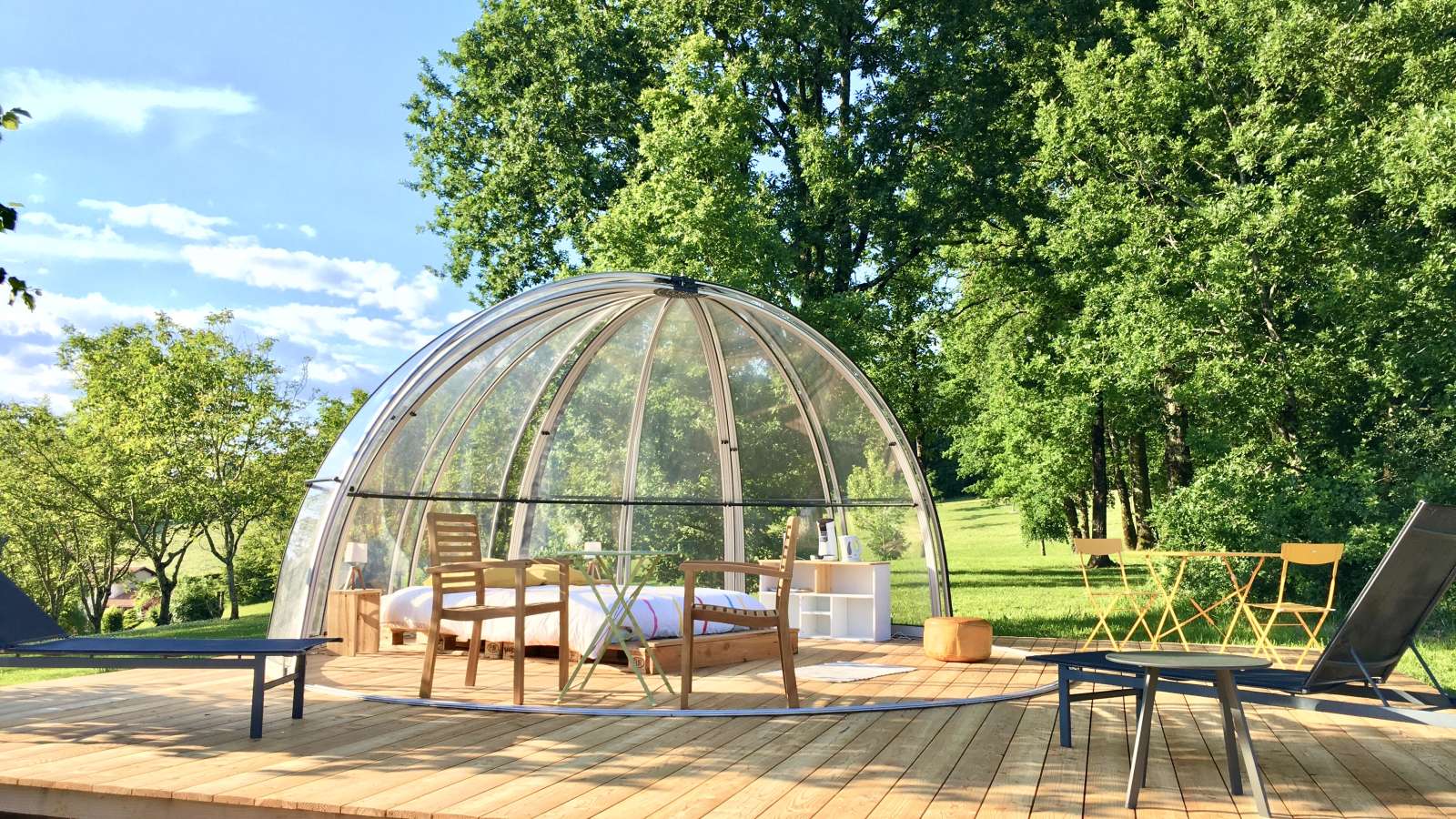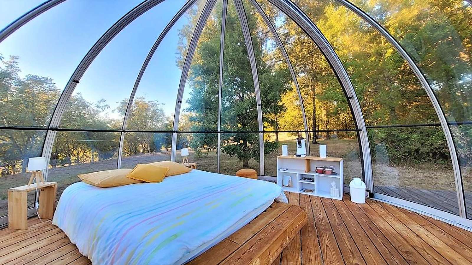 Vivez une expérience féérique dans notre dôme Céleste situé au Sud de la Charente et aux portes du Périgord dans un cadre paisible et verdoyant, tout près du magnifique village d'Aubeterre sur Dronne, classé "Plus Beau Village de France". Dans notre maison d'hôtes Casa Sana, l''esprit est sauvage et responsable, l'ambiance est conviviale et le cadre verdoyant, c'est le lieu idéal pour se ressourcer… à deux, en famille ou entre amis. Profitez de notre table d’hôte locale et de saison et de tous les services qui participeront à votre confort et à votre bien être : parking, wi-fi, piscine, aire de jeux, ping-pong, vélos, animaux de ferme, épicerie locale… A proximité, vous serez séduit par les nombreuses activités de loisirs que nous ne manquerons pas de vous conseiller : baignade, canoë, kayak, accrobranche, labyrinthe végétal, golf, mini-golf, tennis, équitation, marchés, châteaux... Situé à l'orée d'un bois, entièrement vitré et sans vis-à-vis, notre dôme vous accueillera en toute intimité et saura vous charmer par son confort exceptionnel et sa simplicité. Ce sera le lieu idéal pour profiter des beautés de la nature : coucher du soleil, chant des oiseaux, vent dans les arbres. La nuit tombée, bien au chaud sous la couette, laissez-vous envoûter par le ciel étoilé et les douces mélodies nocturnes. Grâce à sa conception moderne, vous pourrez très facilement ouvrir les portes latérales de la bulle jusqu'à 180° pour rafraichir l'atmosphère et profiter pleinement de l'espace extérieur et de la terrasse. Toute la famille vous attend pour partager son art de vivre et ses douceurs locales.