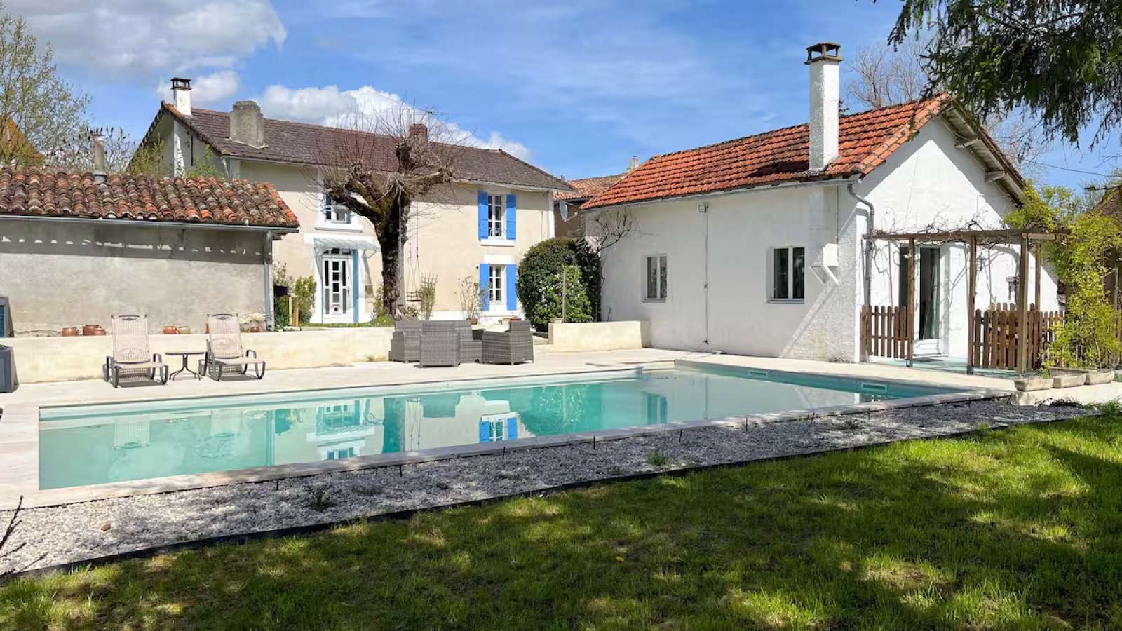 Détendez-vous avec toute la famille à La Maison du Charpentier Situé juste à l'extérieur de la charmante ville d'Aubeterre. Avec une piscine commune de 10 x 5 m Ouvert de mai à septembre. (Chauffée à partir d'août) récemment installée, donnant sur des cha Maison de 4 chambres - 2 chambres à lits jumeaux et 2 chambres doubles (les chambres 3 et 4 sont en train d'être rénovées pour la saison 2025). Cette maison est confortable pour une famille de 6 personnes (tables, chaises, canapés, etc.) et, dans des circonstances exceptionnelles, 2 enfants ou membres de la famille supplémentaires peuvent être accueillis. Cuisine entièrement équipée. Salon spacieux, jardin privé clôturé avec terrasse. Piscine commune de 10 x 5 m et terrasse. Situation tranquille au centre du village avec accès direct à la rivière et à la campagne. Possibilité de louer également le petit gîte entièrement équipé pouvant accueillir 2 personnes supplémentaires et disposant d'un grand jardin privé. Sous réserve de disponibilité. airbnb.co.uk/h/lepetitverger Veuillez noter que nous ne facturons pas de frais de nettoyage, alors attendez-vous à ce que la maison soit laissée dans l'état où vous l'avez trouvée, le matériel de nettoyage est fourni gratuitement.