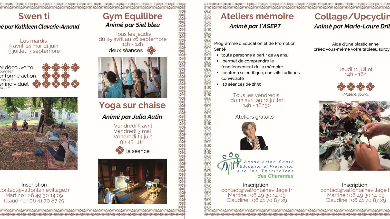 Ateliers bien-être et créatifs selon calendrier d'avril à septembre.