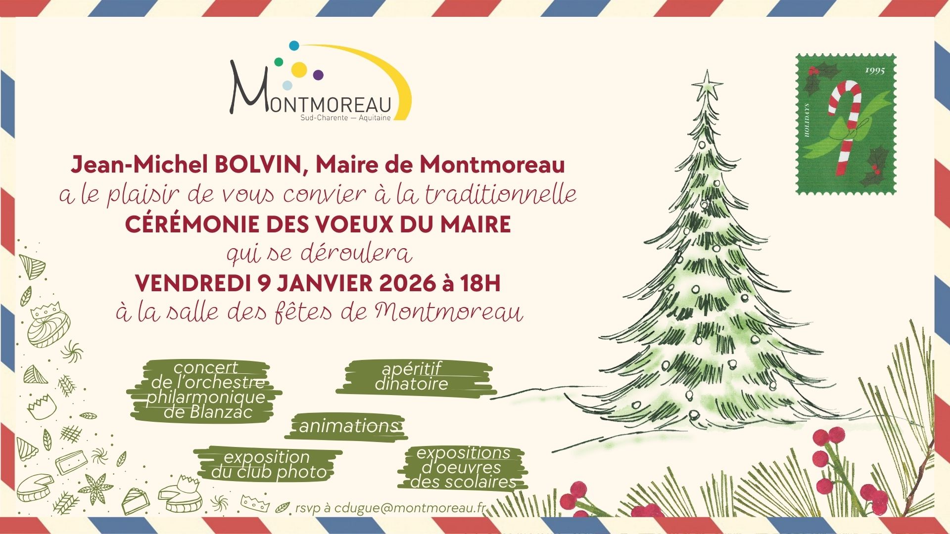 Jean-Michel BOLVIN, Maire de Montmoreau, a le plaisir de vous convier à la traditionnelle Cérémonie des Vœux du Maire! - Concert de l'orchestre philharmonique de Blanzac! - Exposition du club photo! - Apéritif, Dinatoire! - Animations! - Expositions d’œuvres des scolaires!