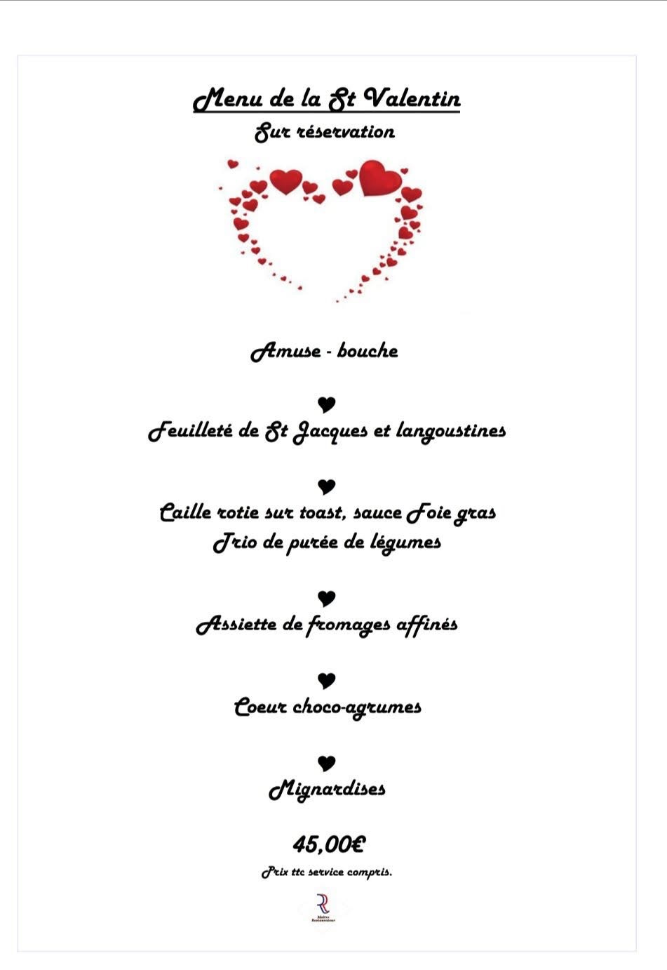 Venez fêter la Saint-Valentin dans un cadre chaleureux, au restaurant Le Bon Repas. Les deux chefs, tous deux maitres restaurateurs vous garantissent une cuisine entièrement maison, réalisée avec des produits frais et pour la majorité locaux. Sur réservation. Amuse -bouche Feuilleté de Saint-Jacques et langoustines Caille rôtie sur toast, sauce foie gras, trio de purée de légumes Assiette de fromages affinés Coeur Choco-agrumes Mignardises