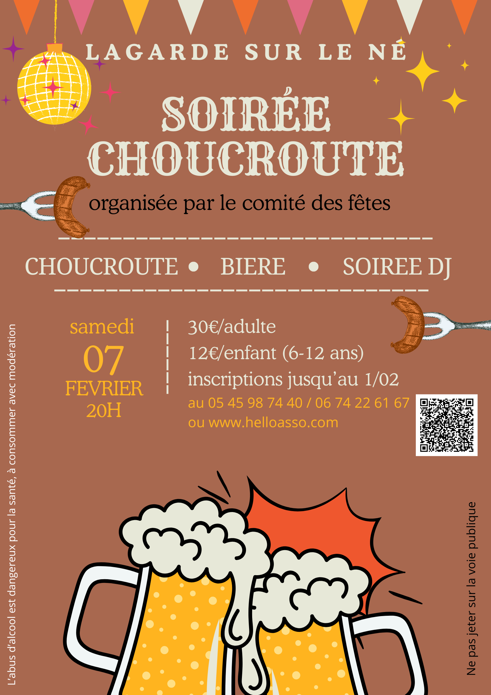 Le comité des fêtes de Lagarde sur le Né vous convie à sa traditionnelle Soirée choucroute animée par DJ Dam's, avec bière à volonté. Venez passer une agréable soirée autour de notre traditionnelle Choucroute, avec bière à volonté. La soirée est animée par DJ Dam's, vous avez également la possibilité de réserver un menu alternatif si vous n'aimez pas la choucroute. Menu enfant également proposé et vin à la vente. Puis, vous pourrez ensuite danser jusqu'au bout de la nuit. Cette année, vous avons fait appel à la Maison Cosset de Jonzac pour le repas. Réservation par mail, ou sur helloasso.com