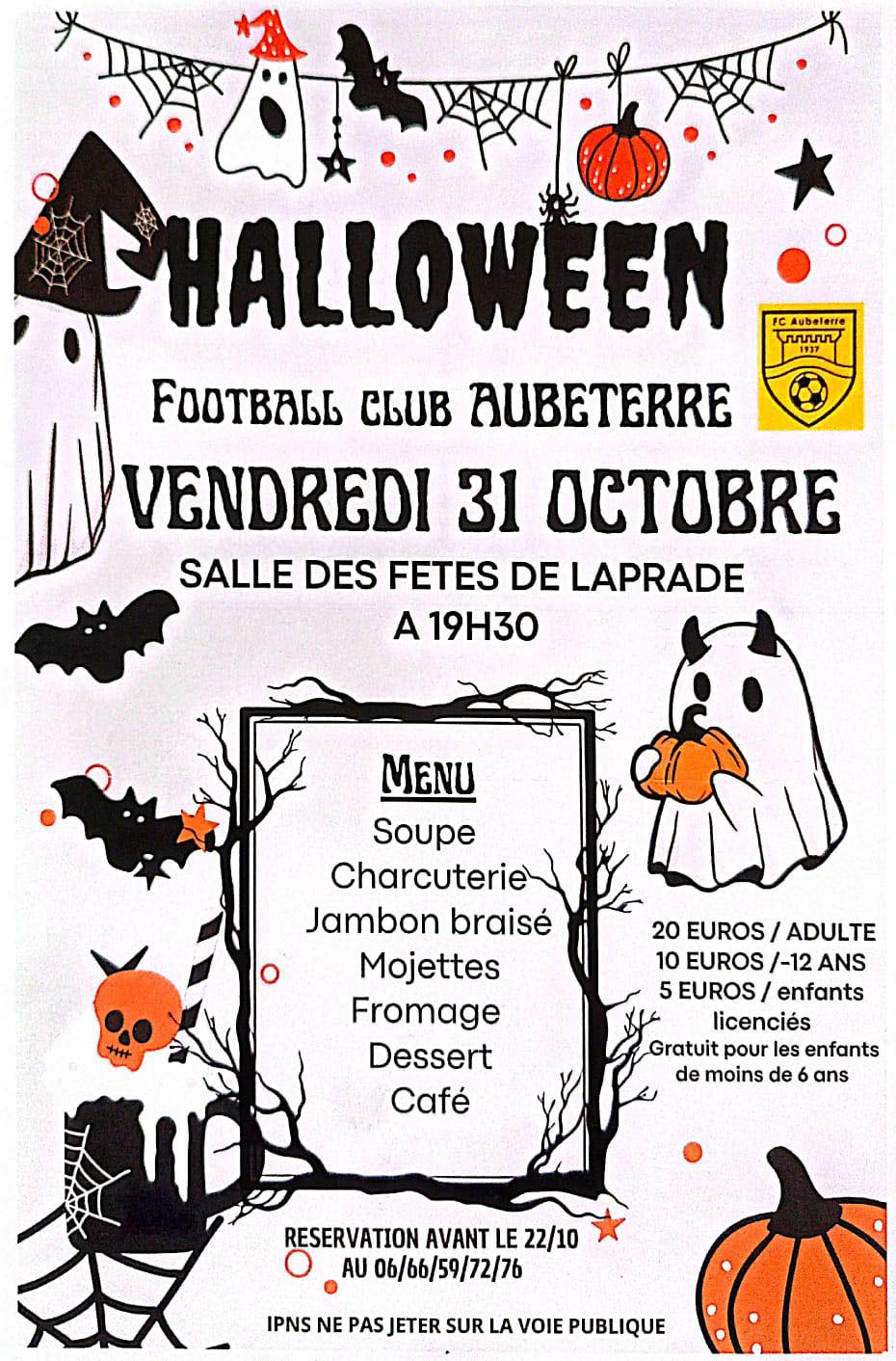 Football Club Aubeterre vous invite à célébrer Halloween autour d'un repas partagé. Menu: Soupe - Charcuterie - Jambon braisé - Mojettes - Fromage - Dessert - Café Réservation avant le 22/10