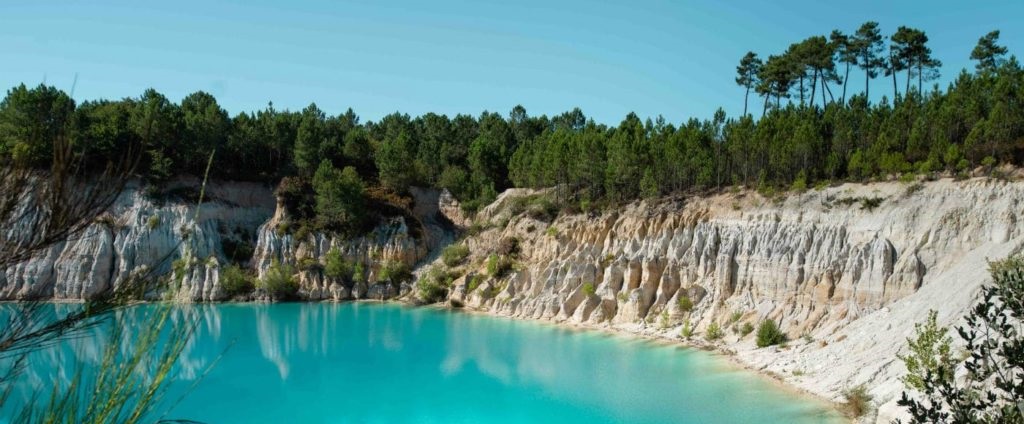 Anciennes carrières d’extraction d’argile aujourd’hui comblées d’eau, les étangs bleus de Touvérac sont un des paysages époustouflants du Sud Charente. L’eau y est d’un bleu turquoise donnant un air de caraïbes à ces étangs entourés par la forêt.