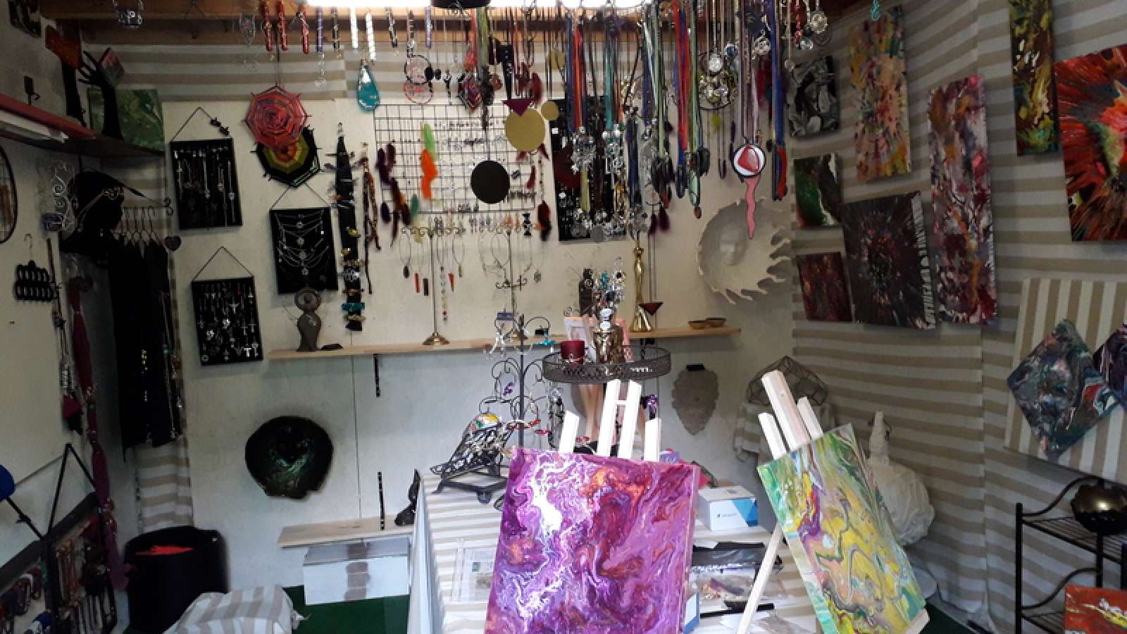 L'atelier / boutique de création elfique est situé chez l'artiste. Vous y découvrirez ses diverses créations ; peinture intuitive (fluid' art 3D), vitrail tiffany, sculptures, tie and dye, bijoux en cuir ...