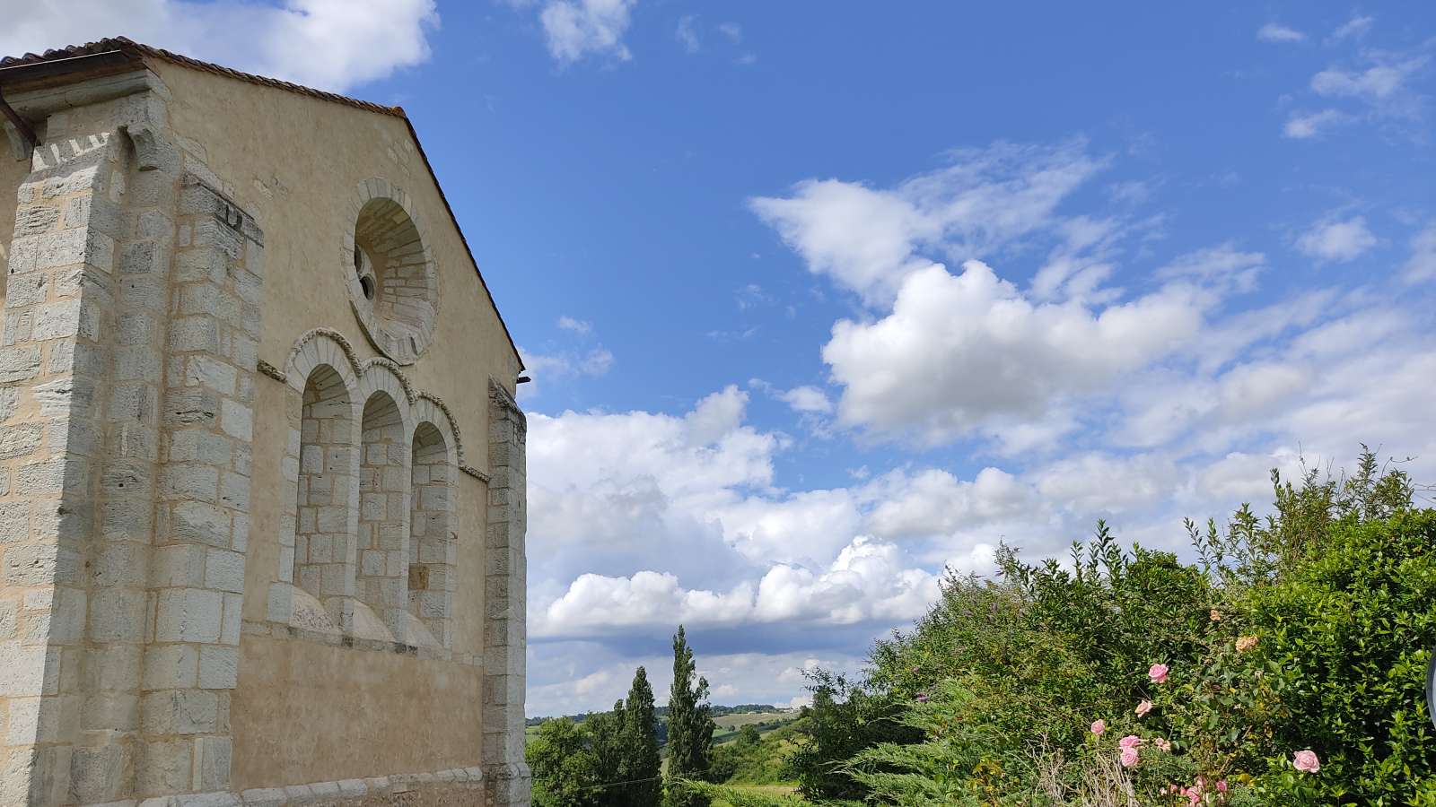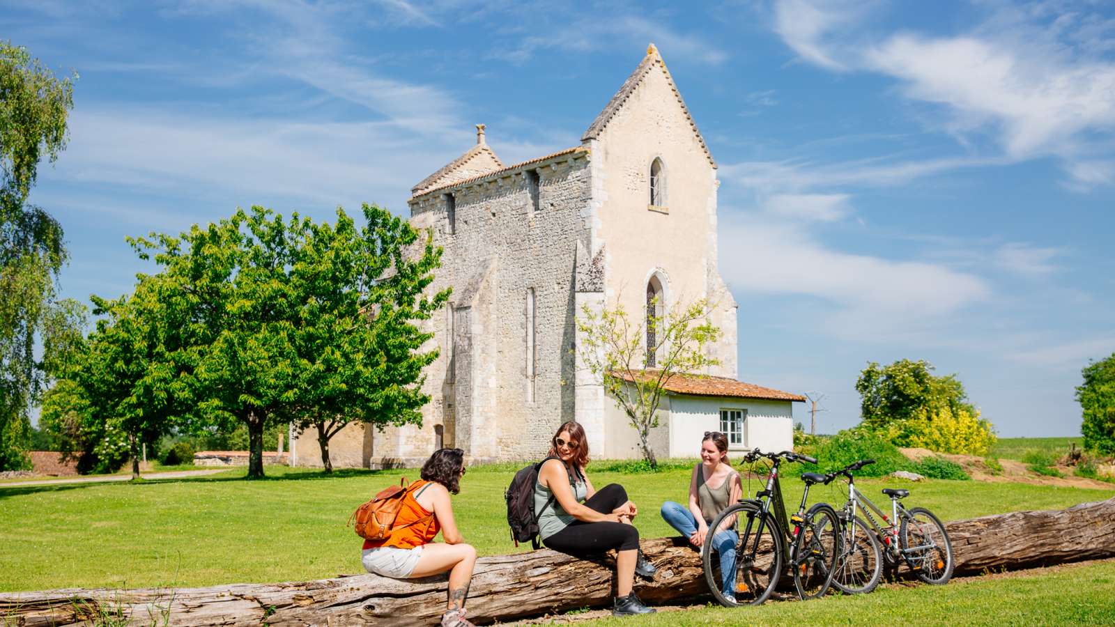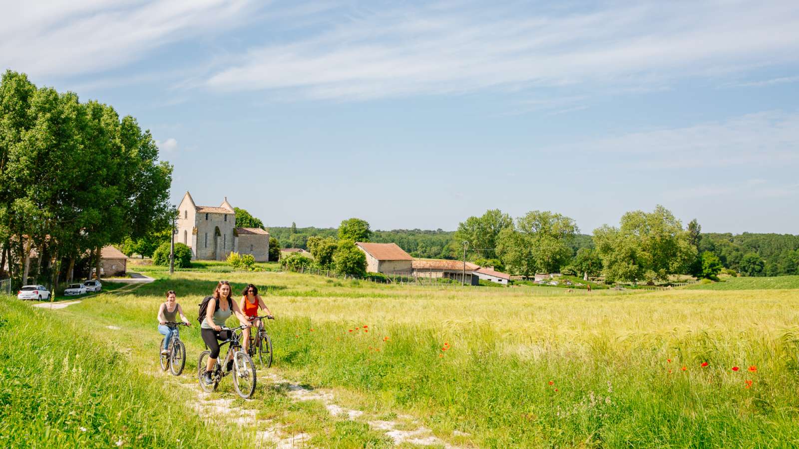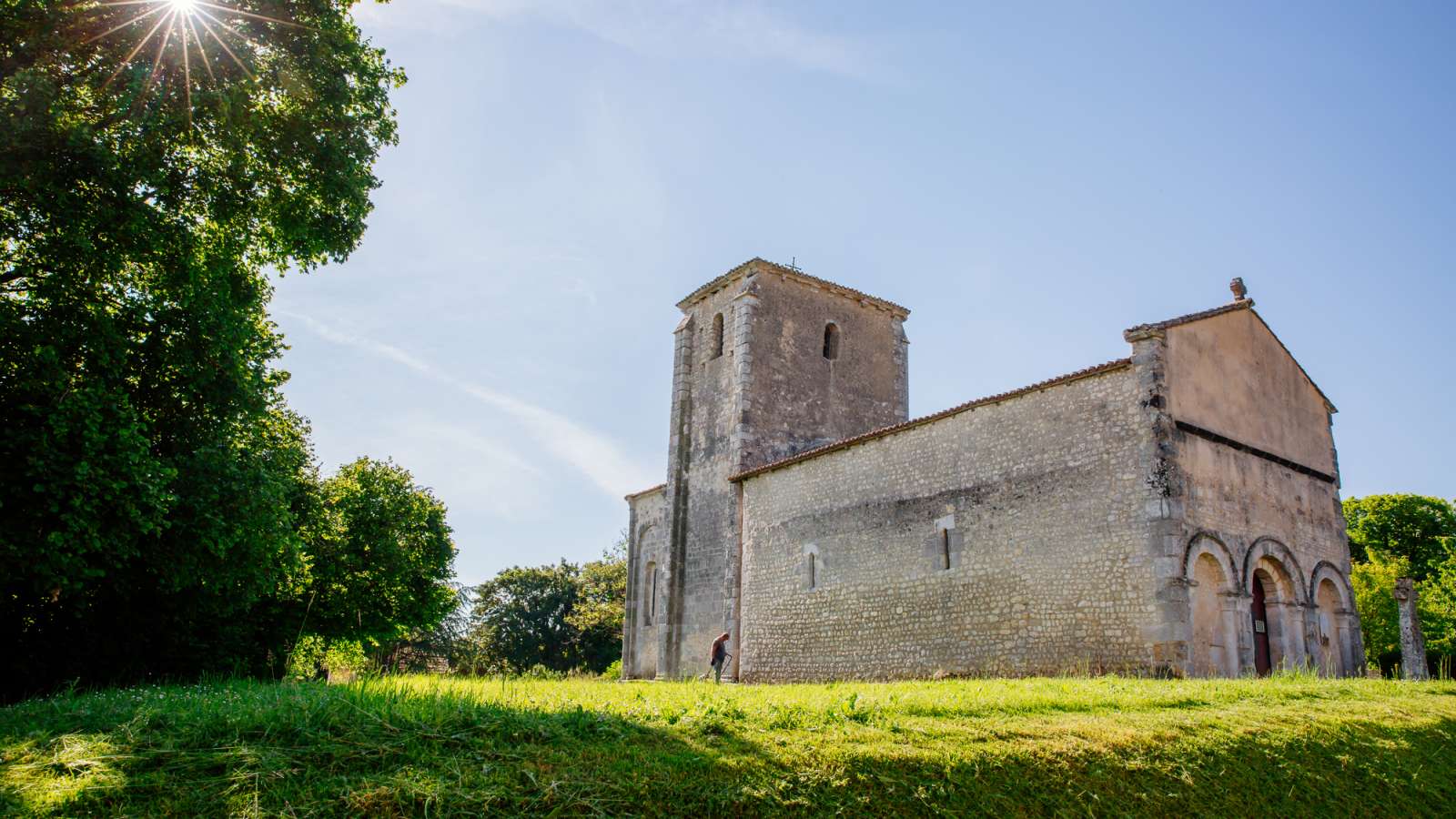 Partez sur un circuit offrant de beaux points de vue sur la campagne vallonnée du Sud Charente aux couleurs changeantes au fil des saisons, passant des ocres aux blancs des collines crayeuses l’hiver, et du vert au doré des cultures aux beaux jours. La jolie cité de Blanzac-Porcheresse est établie dans la fertile vallée du Né, ville de foire sur la route de Saint-Jacques. Elle était prospère au Moyen-Age suite à la construction d’un château fortifié par une branche de la famille de La Rochefoucauld. La place ombragée du village fait face à l’église collégiale Saint Arthèmy et sa belle façade ornée de faisceaux à colonnes fait voyager vers l’Orient. À l’intérieur, sculptures et peintures murales vous émerveilleront. Vous pourrez apercevoir la tour du château de Blanzac, haute tour défensive, du XIIIe siècle, seul vestige de l’ancien château fort. Puis, vous partirez à la conquête de la chapelle des templiers juchée sur une éminence, qui domine le paysage de vignes alentour. L’intérieur renferme de magnifiques fresques du XIIe siècle se détachant sur fond rouge et blanc. Au cœur des collines du Blanzacais, cette chapelle construite au milieu du XIIe siècle, appartenait à la commanderie de templiers nommée "du Dognon". Si vous le souhaitez, avant de poursuivre votre boucle, continuez jusqu’à l’église Saint-Cybard de Porcheresse, l’une des plus ancienne de l’Angoumois. Elevée au XIe siècle elle en présente les caractéristiques : fenêtres étroites à linteau monolithe, percées dans les contreforts ainsi que des murs en moellons. (Accès au public non autorisé). Ensuite vous arriverez à l’église SaintJacques-de-Conzac, poussez la porte de l’édifice, admirez sa nef unique et son abside aux chapiteaux sculptés, où figurent de nombreux entrelacs mêlant animaux et végétaux. En revenant sur Blanzac, vous longerez le Né, une charmante petite rivière, sur laquelle subsistent les vestiges de beaux moulins à eau.