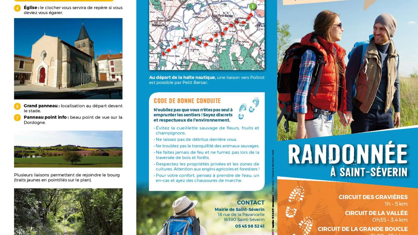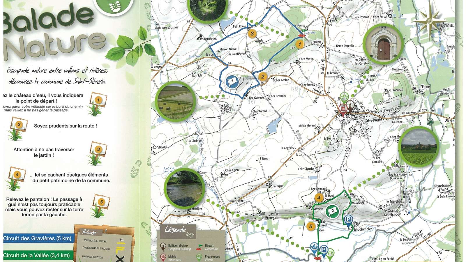 Découvrez la commune de Saint-Séverin à travers ses vallons et sa campagne verdoyante, naturellement délimitée par les trois vallées de la Dronne ainsi que les collines boisées des Gravières et de Puy Giraud. Repérez le château d’eau, point culminant de la commune, il vous indiquera le point de départ. Vous pouvez garer votre véhicule sur le bord du chemin, mais veillez à ne pas gêner le passage. Un panneau Point info se trouve à proximité, d’où vous aurez un très beau panorama et un point de vue sur ce joli bourg très vivant. Ensuite, vous traverserez l’une des dernières zones d’élevage de la commune et pourrez apprécier de vous balader dans les bois et prairies paisibles et flânerez au bord d’un étang.