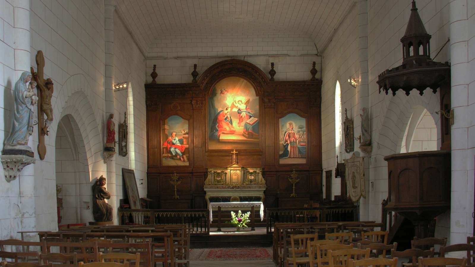 L’église Saint-Pierre et Sainte-Radegonde est construite à la fin du XIIe siècle, début du XIIIe. Elle possède de nombreux éléments datés de la Renaissance (chapelles, portail, clocher, cloche), ce qui constitue un des intérêts majeurs de l’édifice. Les deux chapelles, le clocher et la façade ont été bâtis durant la première moitié du XVIe siècle. L’église abrite une cloche datée du XVIe siècle, ce qui en fait l’une des plus anciennes du département. Dans le chœur de l’église prend place un beau retable en bois sculpté, daté du XVIIIe siècle et protégé au titre des Monuments Historiques. Il est orné de trois toiles peintes où figurent Saint-Pierre, Sainte-Radegonde et la scène de l’Annonciation.