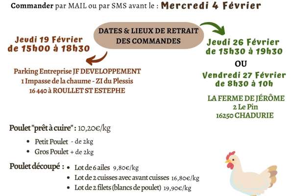 Se renseigner des dates de vente directe de poulet fermier. (3 fois par an).