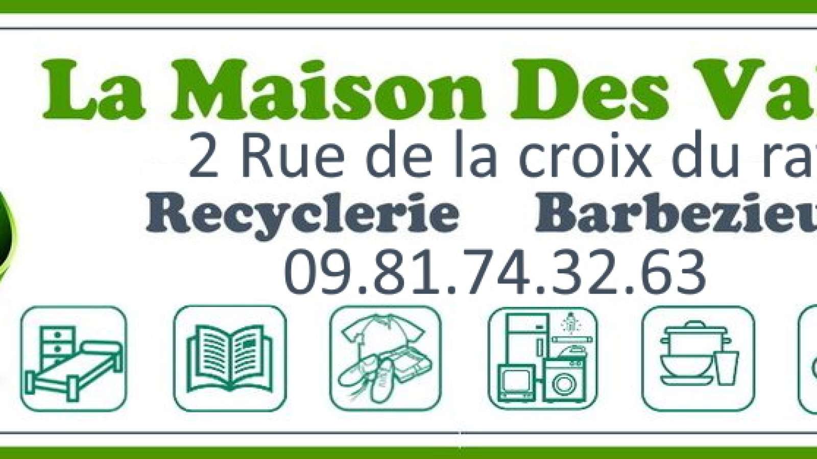 La recyclerie La Maison Des Valeurs, est une association loi 1901, elle vise a réduire les déchets, par son action de collecte, de remise en état, et de vente d'objets inutilisés. La recyclerie La Maison Des Valeurs, est une association Loi 1901, Elle est réservée à des adhérents (adhésion 1 € par an/famille/foyer/même adresse), elle vise à réduire les déchets par son action de collecte auprès des particuliers et des professionnels, elle remet en état, et revend des objets en bon état (vêtements, meubles, décos, livres, jouets, matériaux jardinages,.....). Grâce aux dons et aux achats des adhérents, elle crée de l'emploi sur le territoire.
