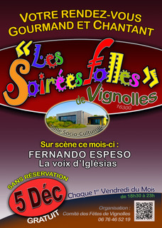 Marché gourmand avec animation musicale. Pour cette édition le Comité des Fêtes reçoit 3 artistes les plus plébiscités au cours de la saison 2024 avec Ian Scott et Patrice Deletre et Fernando Espeso Calvo. Fernando Espeso Calvo vient d'Espagne et a été lauréat de l'émission "La Belgique a un incroyable talent". Il embarquera, une fois encore, toute la salle avec sa voix envoûtante et ses reprises de Julio Iglesias . Il s'agit là de son incroyable talent. Le concert débutera à 20H15 et, bien que ce soit un artiste de renommée internationale, l'accès à ce spectacle reste gratuit. Vu le nombre d'appels relatifs à la présence de ce chanteur, il est possible de réserver afin d'être assuré d'avoir une place assise; 06 76 46 52 19 Pour cette édition de décembre nous mettrons en place un petit marché de Noël couvert, avec quelques idées cadeaux très originales Steffy Prx, La Puce à l'Oreille, Shiba Games , Shogan , Yolande Bichon, ..... Quant au marché gourmand, il ouvrira au public à partir de 18H30 et nous recommandons toujours d'amener ses couverts