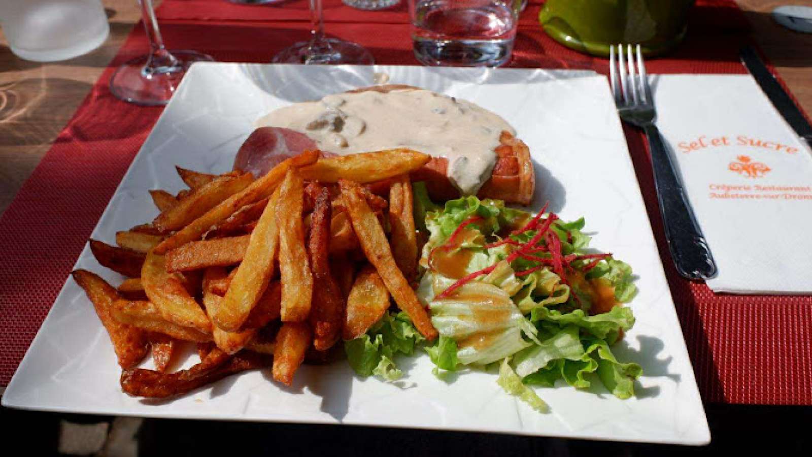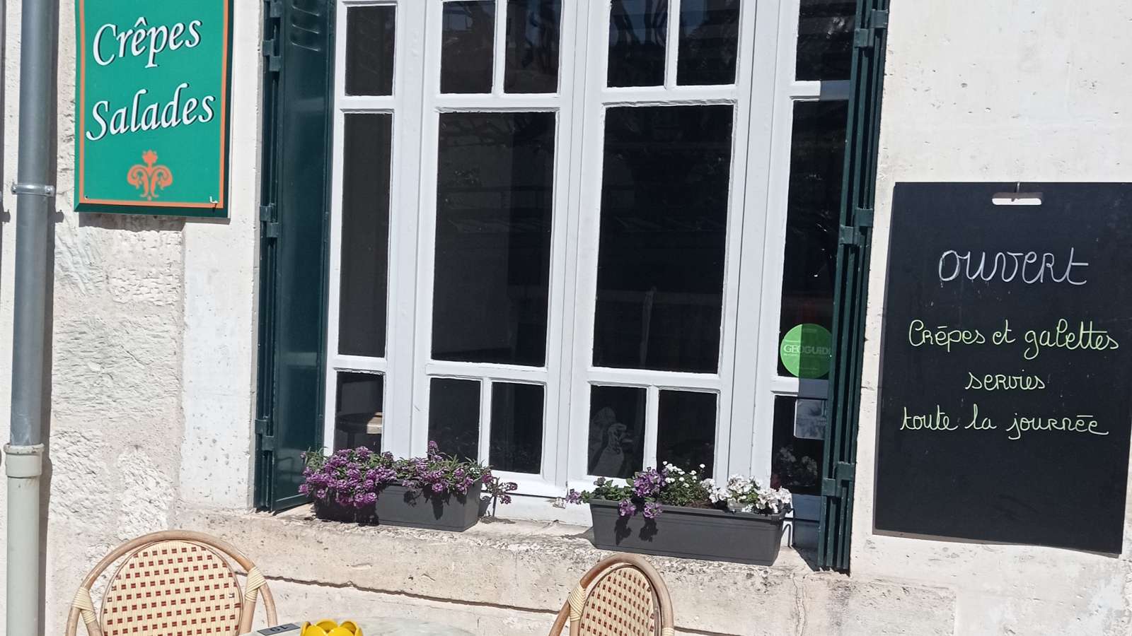La crêperie Sel et Sucre vous accueille sur la jolie place principale du village d'Aubeterre-sur-Dronne. Elle propose restauration et bar dans une ambiance conviviale et sympathique. Pour le repas du midi ou soir : choix de galettes au sarrasin, crêpes sucrées, omelettes, salades, viandes accompagnées de frites maison. Nos galettes et nos crêpes sont élaborées à base de farine bio locale (St Privat), à la main (sans robot). Le foie gras présenté dans nos salades périgourdines est fait "maison". Nos gésiers proviennent de Vanxains ( 24) . Horaires des repas : le midi jusqu'à 15h00 et le soir à partir de 19h00.