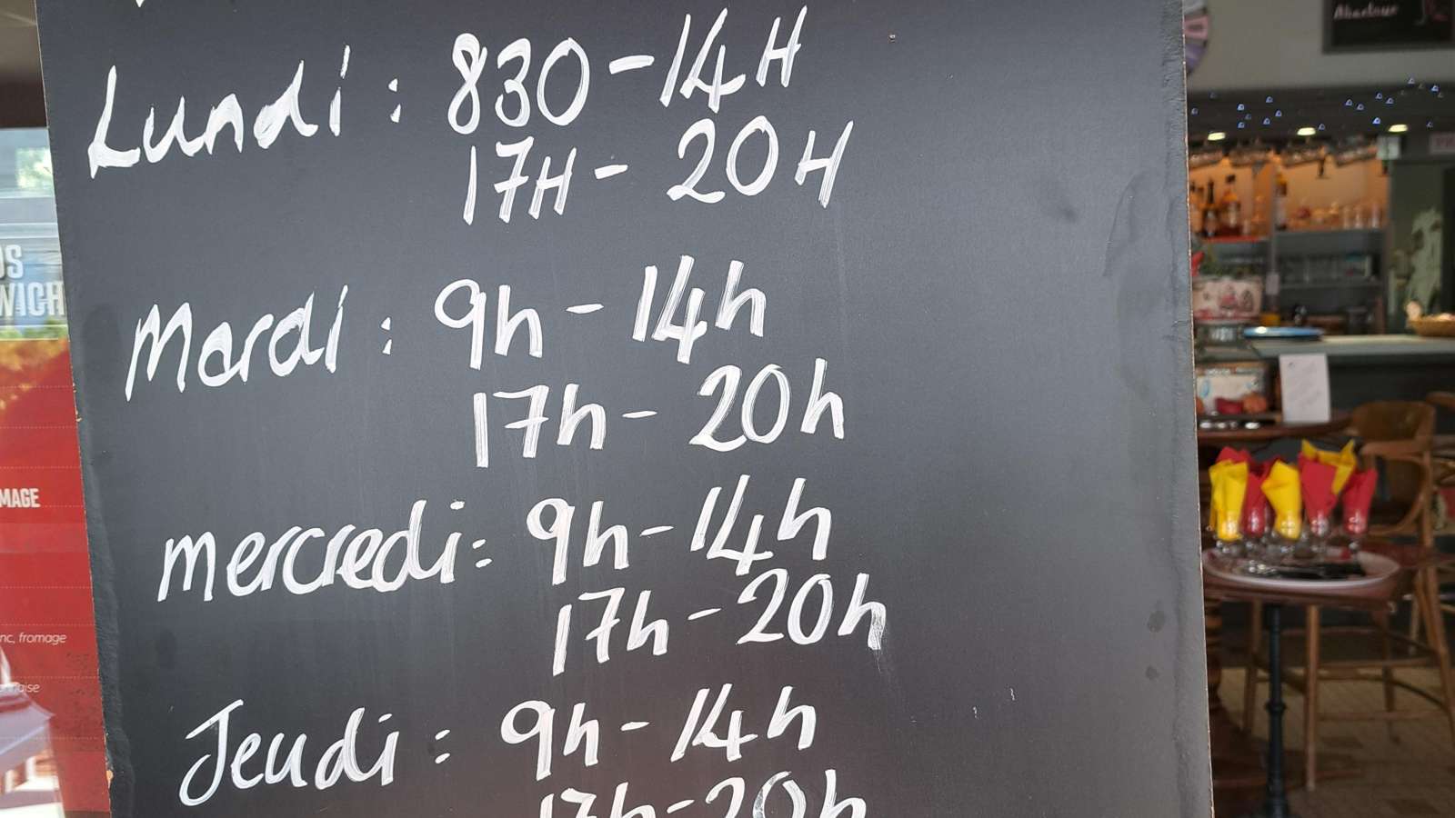 Du 01/01 au 31/12 le lundi de 8h à 14h et de 17h à 21h. Le mardi, mercredi et jeudi de 9h à 14h et de 17h à 21h. Le vendredi et samedi de 9h à 14h et de 17h à 22h. Le dimanche de 10h à 14h et de 17h à 21h.