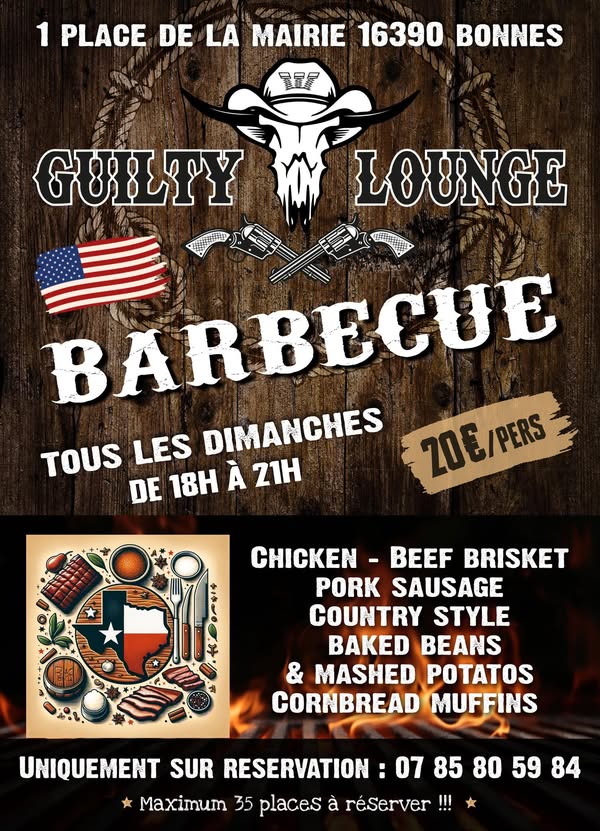 Le rendez-vous 100% US au Guilty Lounge ! Le Guilty Lounge, c’est votre nouveau resto à l’ambiance western, avec une déco stylée, de la bonne cuisine américaine et une atmosphère détendue. Venez profiter d’un verre, d’un bon repas… et d’un bon moment ! Tous les dimanches soirs, de 18h à 21h, le Guilty Lounge à Bonnes vous embarque pour un voyage culinaire aux accents du Sud des États-Unis ! Au menu : chicken, beef brisket, pulled pork, saucisses, accompagnés de baked beans, purée maison et les incontournables cornbread muffins. ️ 20€ par personne – Sur réservation uniquement ⚠️ Places limitées à 35 convives, alors pensez à réserver vite ! Réservation indispensable – venez vous régaler dans une ambiance conviviale, fumée et authentique !
