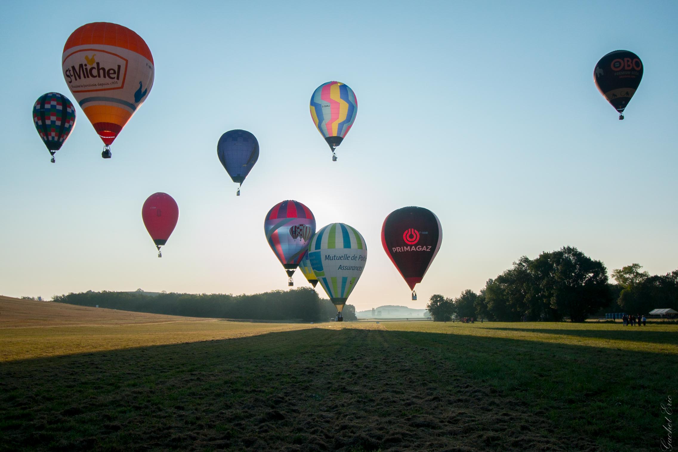 Nous prenons de la hauteur et apercevons les habitants, tout juste levés, nous saluer depuis leur jardin. Nous gagnons encore de l’altitude et survolons la campagne charentaise baignée par la lumière rose orangé du soleil levant. Le panorama est grandiose dominé par le camaïeu de verts des vignes et champs de maïs. Nous partons en direction de Mosnac, Simeux puis Châteauneuf sous un léger vent d’Est. À plusieurs reprises, nous survolons la Charente. Je penche la tête pour admirer dans l’eau du fleuve le reflet du ballon avant que celui-ci ne bifurque au-dessus des bosquets.
